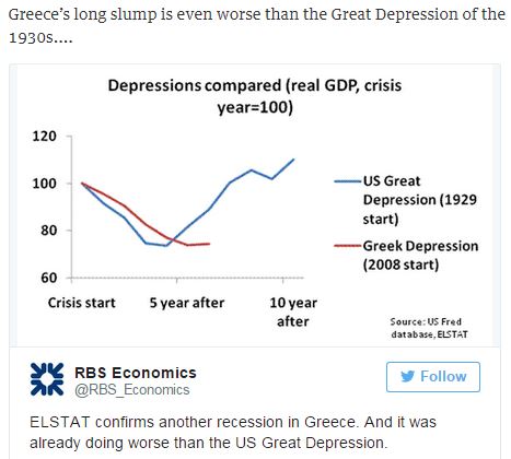 Η παρατεταμένη ύφεση που έχει πλήξει την Ελλάδα είναι χειρότερη ακόμη και από τη Μεγάλη Ύφεση της δεκαετίας του 1930 υποστηρίζει ανάλυση της Royal Bank of Scotland, σχολιάζοντας τα στοιχεία της ΕΛΣΤΑΤ για το α’ τρίμηνο του 2015 που δείχνουν πτώση 0,2% του ΑΕΠ.