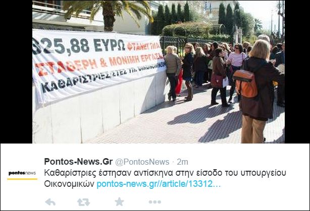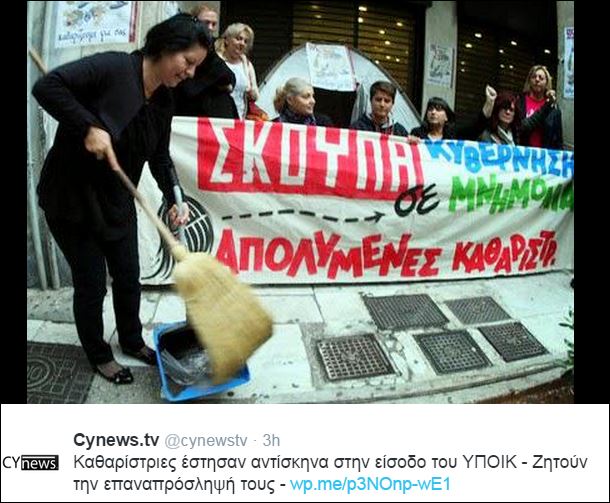 Και όλα αυτά τη στιγμή που έξω από το υπουργείο Οικονομικών έχουν στήσει, από χθες, αντίσκηνα οι καθαρίστριες, με σύμβαση έργου, ενώ αναμένεται να παραστούν και καθαρίστριες από όλη την χώρα. Ωστόσο, χθες πραγματοποιήθηκε συνάντηση με τον κ.Βαρουφάκη, ο οποίος τους είπε πως θα εξετάσει το ζήτημά τους.