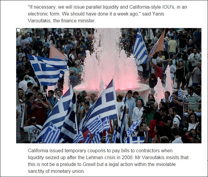 «Αν χρειαστεί θα εκδώσουμε παράλληλη ρευστότητα και IOU’s τύπου Καλιφόρνιας σε ηλεκτρονική μορφή», ανέφερε ο υπουργός Οικονομικών, Γιάνης Βαρουφάκης, μιλώντας στην Telegraph.