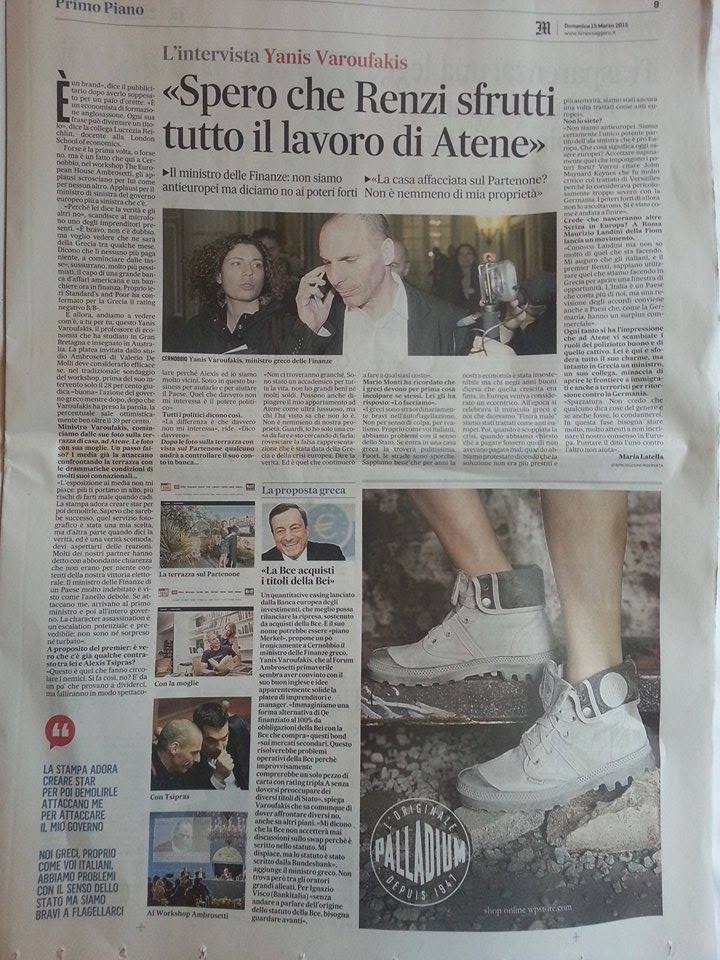 Στο πρωτοσέλιδο της ιταλικής εφημερίδας “Il Messaggero” βρίσκεται ο Γιάνης Βαρουφάκης με τη σύζυγό του Δανάη Στράτου.