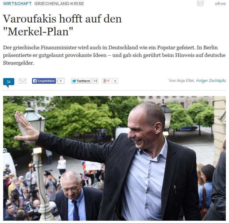 Ο Γιάνης Βαρουφάκης, ο υπουργός Οικονομικών της Ελλάδας ευελπιστεί σε ένα «σχέδιο Μέρκελ» για την Ελλάδα όπως το περίφημο «σχέδιο Μάρσαλ», αναφέρει η Die Welt. Εκτιμά ο ίδιος πως η Μέρκελ πρέπει να αποκτήσει έναν εντελώς νέο ρόλο θυμίζοντας την ομιλία του υπουργού Εξωτερικών των ΗΠΑ Τζ. Μπερνς το 1946 στη Στουγκάρδη.