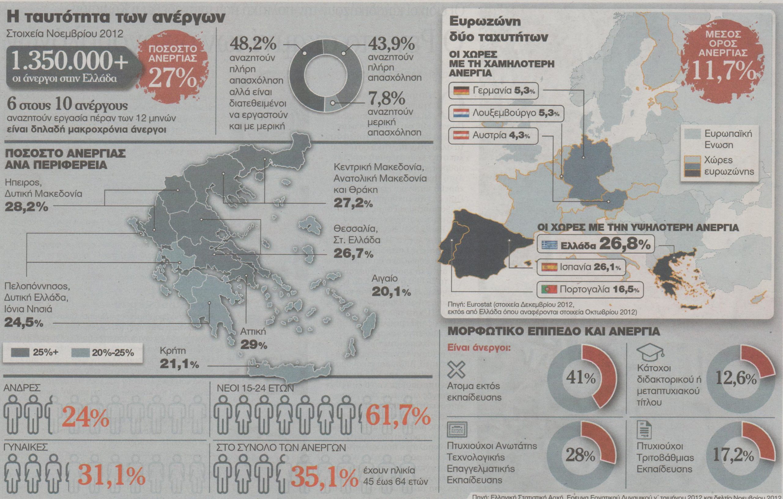 Γυναίκες, νέοι και άτομα με χαμηλή εκπαίδευση αποδεικνύονται τα μεγαλύτερα θύματα της ανεργίας στην Ελλάδα. Χιλιάδες θέσεις εργασίας έχουν χαθεί στη χώρα μας την τελευταία τριετία, ενώ μόλις μέσα σε έναν χρόνο το ποσοστό των Ελλήνων που βρέθηκαν χωρίς δουλειά εκτοξεύτηκε από το 20,8% (Νοέμβριος του 2011) στο 27% (Νοέμβριος 2012) σύμφωνα με τα στοιχεία της Ελληνικής Στατιστικής Αρχής τα οποία παρουσιάζει η εφημερίδα «Τα Νέα».