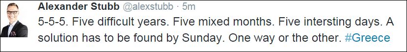 Τη σημασία του αριθμού «πέντε» για την Ελλάδα και τις διαπραγματεύσεις αναλύει μέσω twitter ο υπουργός Οικονομικών της Φινλανδίας, Αλεξάντερ Στουμπ.
