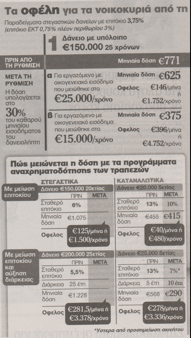 Οι ρυθμίσεις που αφορούν αποκλειστικά τα ενυπόθηκα δάνεια και μάλιστα αυτά που είναι συνδεδεμένα με την πρώτη κατοικία του δανειολήπτη εκτιμάται ότι θα εξυπηρετήσουν περίπου 200.000 νοικοκυριά, τα οποία σήμερα δυσκολεύονται στις πληρωμές των δανείων τους λόγω περικοπών στα εισοδήματά τους και που συνεχίζουν παρά τις δυσκολίες να τα εξυπηρετούν κανονικά.