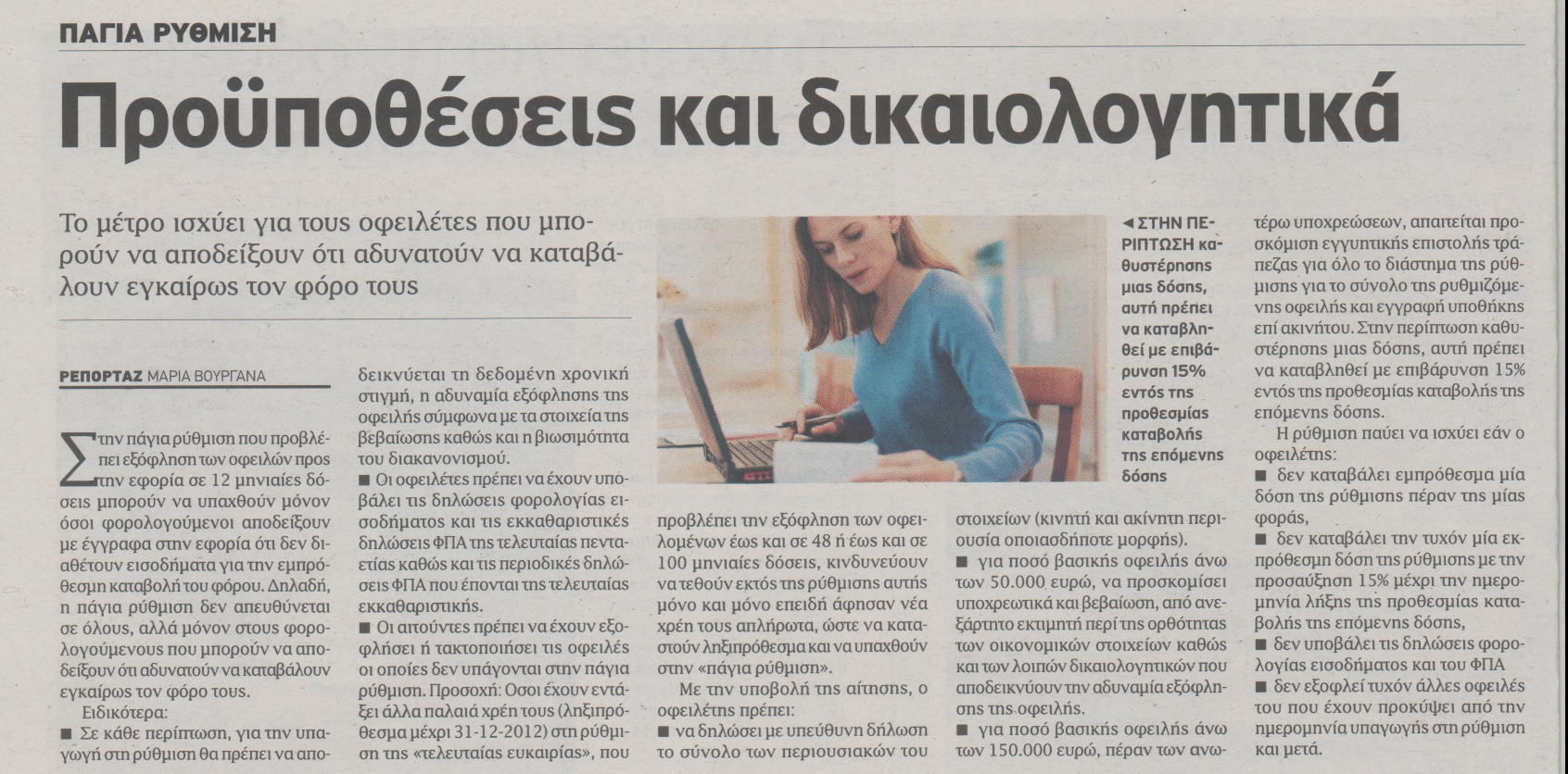 Για να αποφύγουν τις κατασχέσεις οι φορολογούμενοι που χρωστούν στο Δημόσιο ή όσοι δεν θα καταφέρουν να πληρώσουν εμπρόθεσμα τους φόρους τους έχουν τη δυνατότητα να ρυθμίσουν τις οφειλές τους προς την Εφορία έως και σε 12 μηνιαίες δόσεις με την «πάγια ρύθμιση».