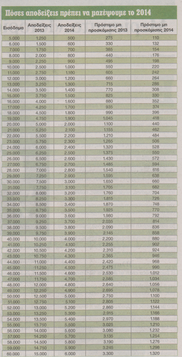 Λιγότερες αποδείξεις θα χρειαστεί να μαζέψουν το 2014 οι μισθωτοί και οι συνταξιούχοι, καθώς η πολιτική ηγεσία του υπουργείου Οικονομικών αποφάσισε να μειώσει από το 25% στο 10% το ποσοστό του ετήσιου εισοδήματος που οι φορολογούμενοι αυτοί θα πρέπει να καλύπτουν με την αξία των συλλεχθεισών αποδείξεων.