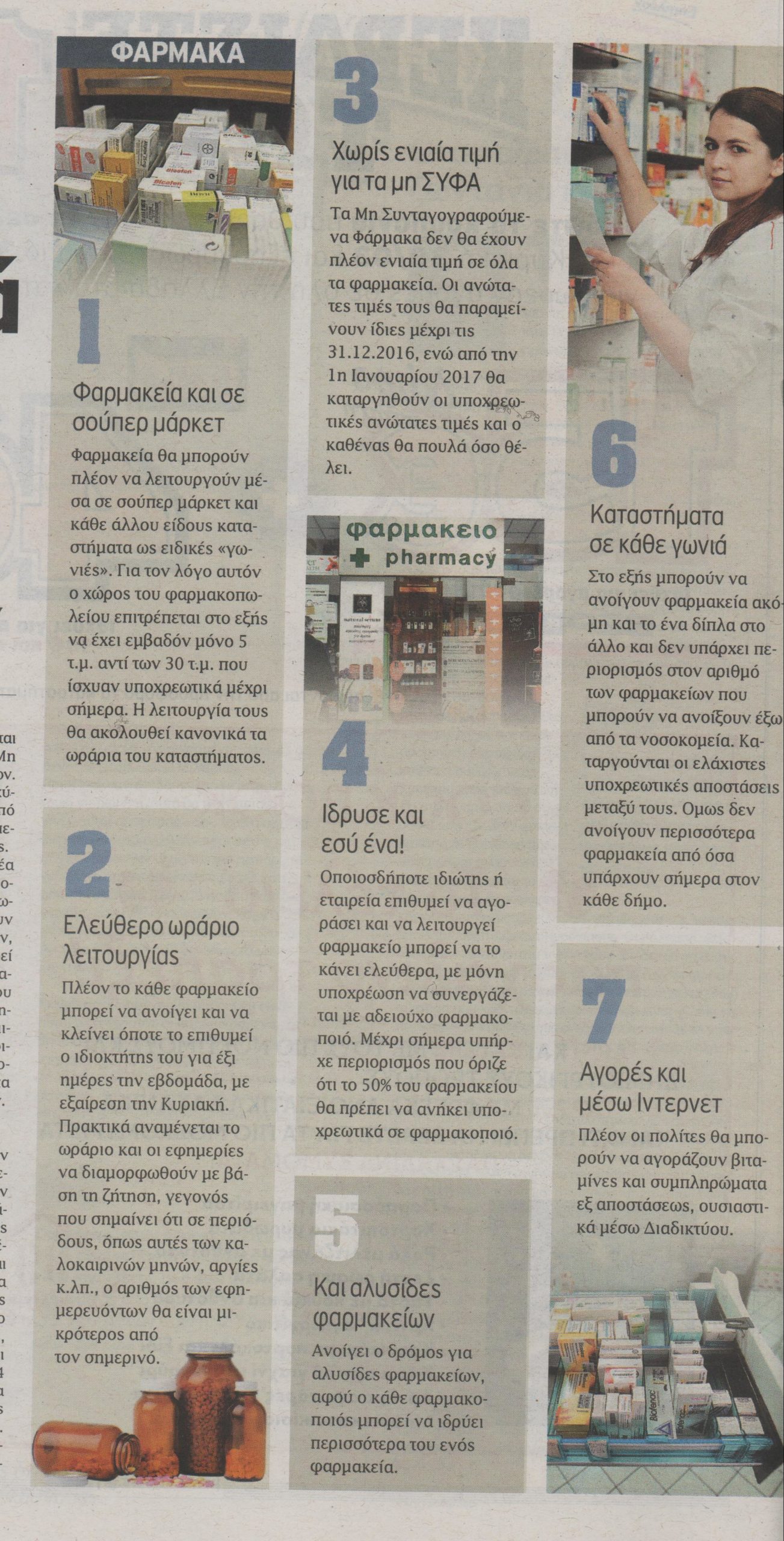 Παράλληλα, φαρμακεία θα μπορούν να λειτουργούν πλέον δίπλα δίπλα, αφού αίρεται η υποχρέωση συγκεκριμένων αποστάσεων μεταξύ τους. Παράλληλα, καταργείται η ενιαία τιμή πώλησης των μη συνταγογραφούμενων φαρμάκων. Μέχρι το τέλος του 2016, θα ισχύει ενιαία ανώτατη τιμή, ενώ από την 1η Ιανουαρίου 2017 θα απελευθερωθεί πλήρως η τιμή τους.