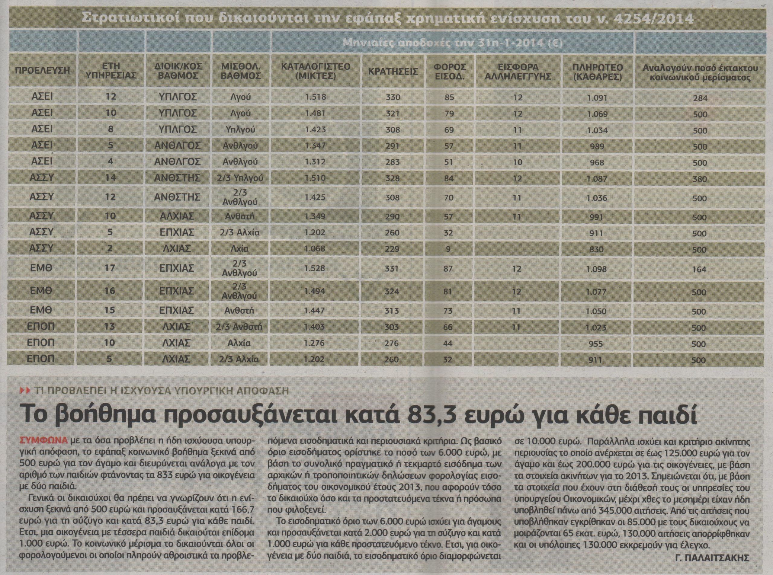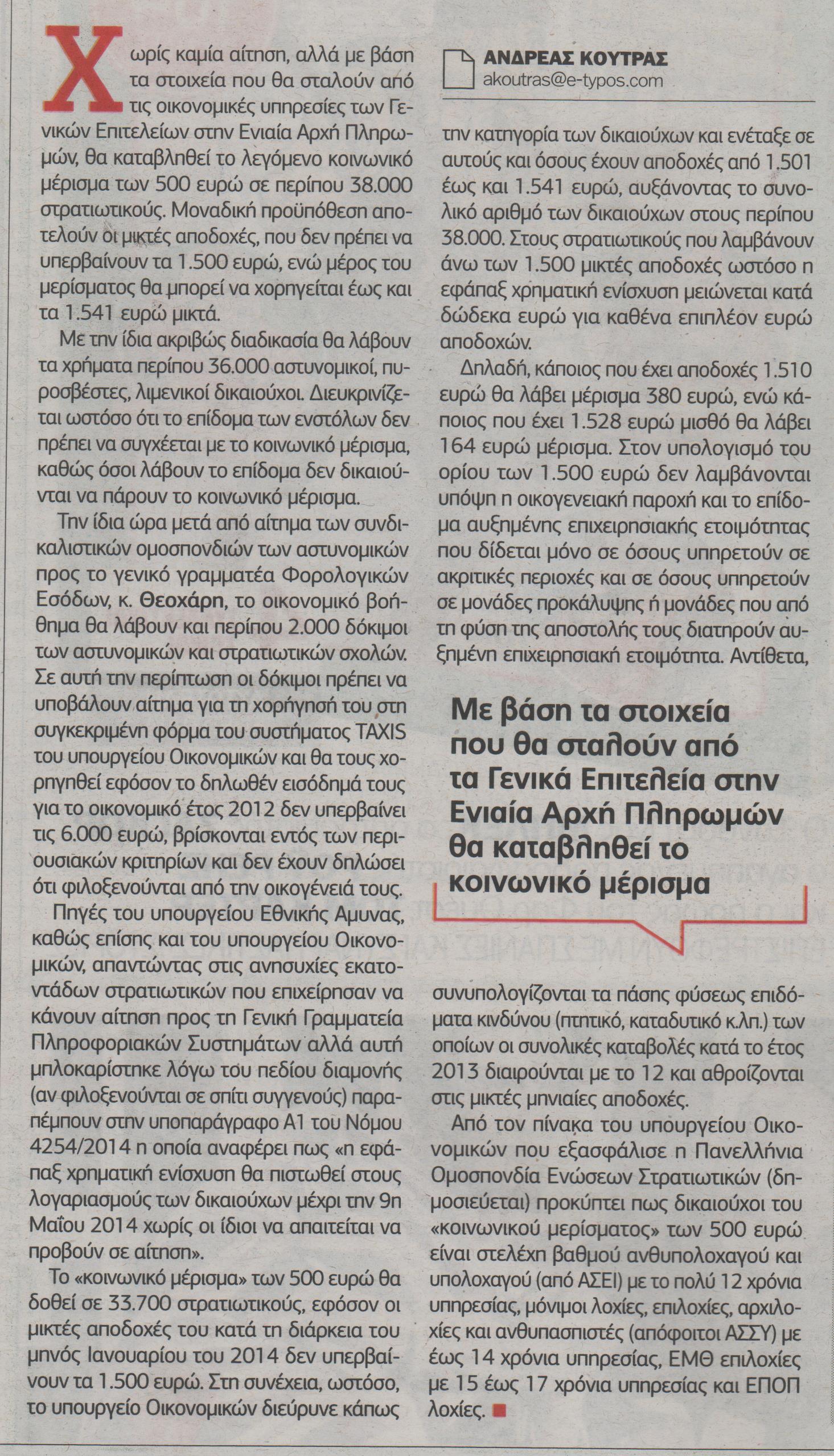 Χωρίς καμία αίτηση, αλλά με βάση τα στοιχεία που θα σταλούν από τις οικονομικές υπηρεσίες των Γενικών Επιτελείων στην Ενιαία Αρχή Πληρωμών, θα καταβληθεί το λεγόμενο κοινωνικό μέρισμα των 500 ευρώ σε περίπου 38.000 στρατιωτικούς. Μοναδική προϋπόθεση αποτελούν οι μικτές αποδοχές, που δεν πρέπει να υπερβαίνουν τα 1.500 ευρώ, ενώ μέρος του μερίσματος θα μπορεί να χορηγείται έως και τα 1.541 ευρώ μικτά.