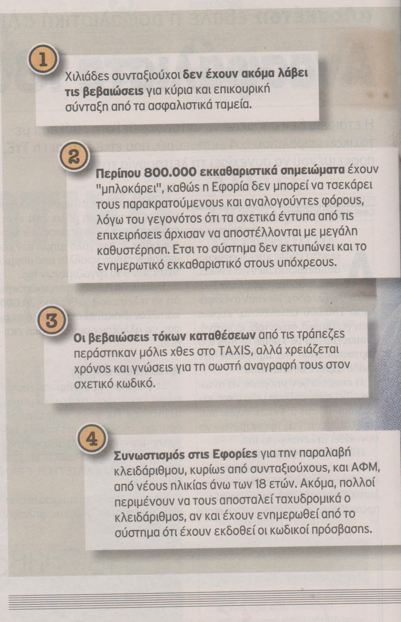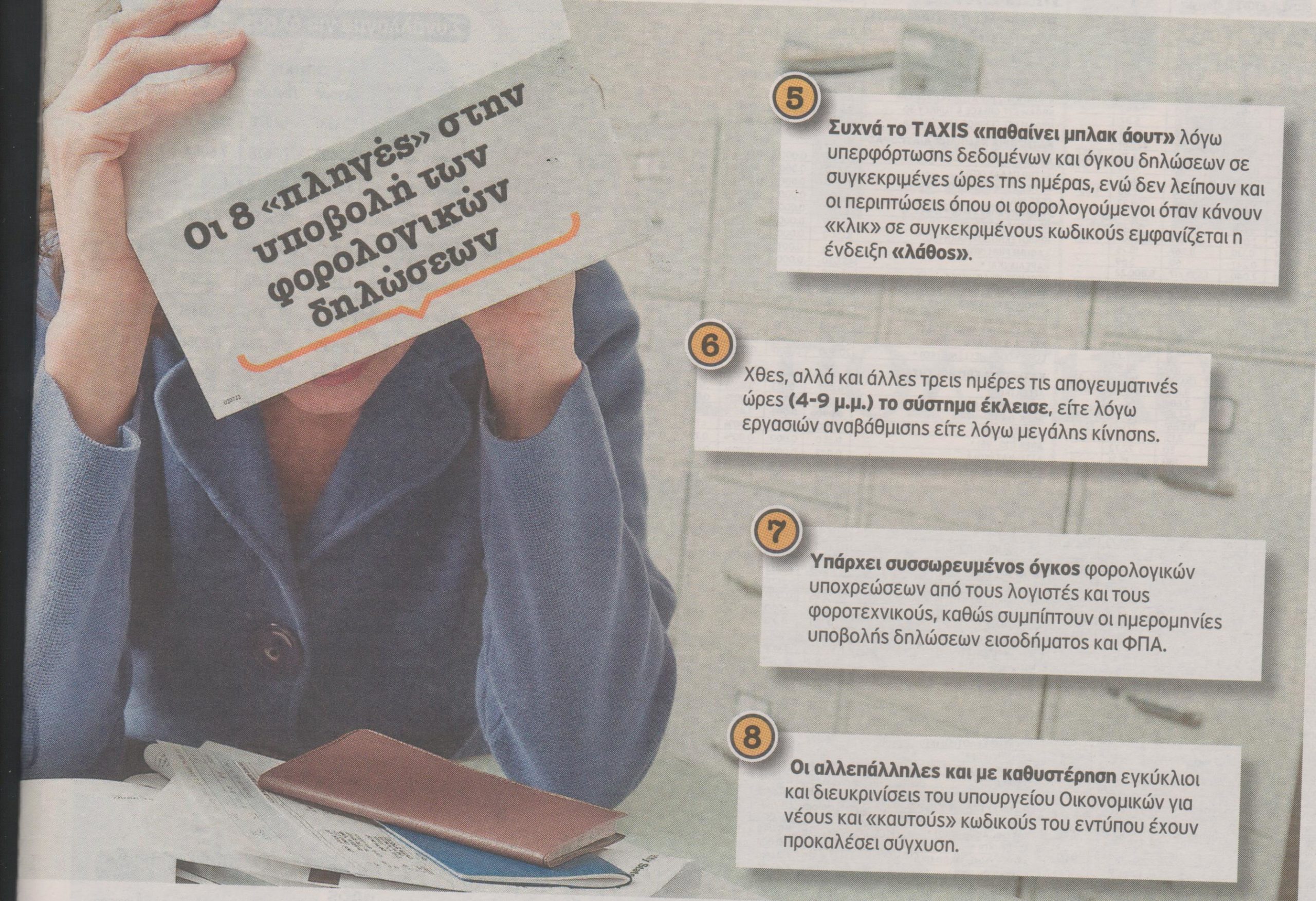 Όπως επισημαίνεται σε δημοσίευμα της εφημερίδας «Έθνος», οκτώ είναι οι βασικές εστίες του πρωτοφανούς σκηνικού ταλαιπωρίας και σύγχυσης, με τους λογιστές και τους φοροτεχνικούς να «έχουν σηκώσει τα χέρια» και να ζητούν οι προθεσμίες να παραταθούν μέχρι τις 30 Σεπτεμβρίου.