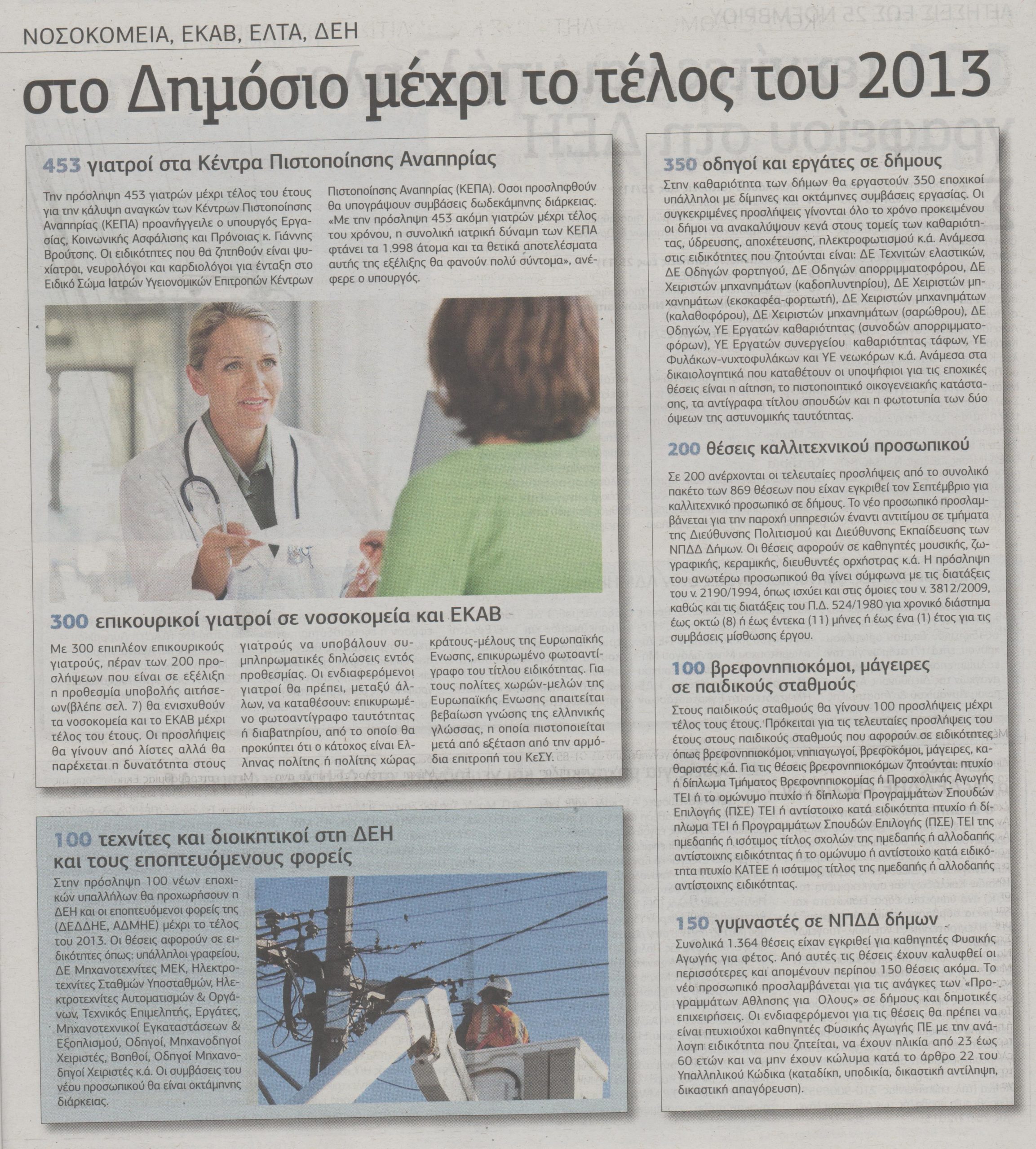 Αναλυτικά, στους δήμους θα απασχοληθούν 700 εποχικοί, στους παιδικούς σταθμούς 100 εποχικοί, τα νοσοκομεία θα ενισχυθούν με 753 γιατρούς, η ΔΕΗ θα προχωρήσει σε 100 προσλήψεις, τα ΕΛΤΑ θα απασχολήσουν 200 νέους υπαλλήλους.
