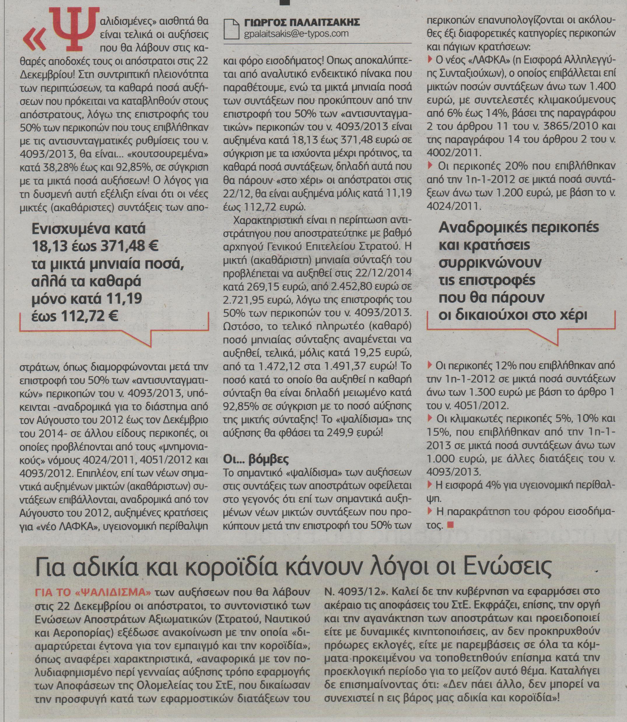 Ο λόγος για τη δυσμενή αυτή εξέλιξη είναι ότι οι νέες μικτές (ακαθάριστες) συντάξεις των αποστράτων, όπως διαμορφώνονται μετά την επιστροφή του 50% των αντισυνταγματικών περικοπών του ν. 4093/2013, υπόκεινται –αναδρομικά για το διάστημα από τον Αύγουστο του 2012 έως τον Δεκέμβριο του 2014- σε άλλου είδους περικοπές, οι οποίες προβλέπονται από τους «μνημονιακούς» νόμους 4024/2011, 4051/2012 και 4093/2012.