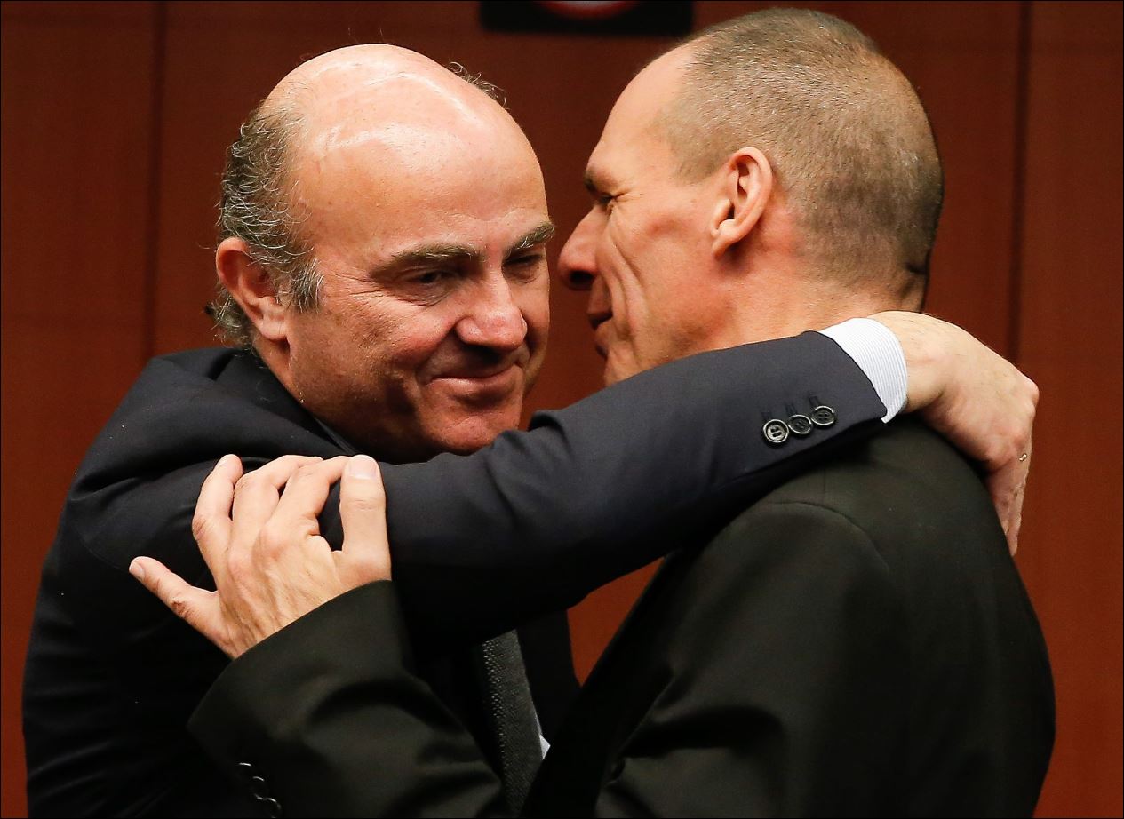 Πριν από την έναρξη της συνεδρίασης του Eurogroup ο Έλληνας υπουργός Οικονομικών, Γιάνης Βαρουφάκης είχε μία ολιγόλεπτη συνομιλία με τον Ισπανό ομόλογό του, Λουίς Ντε Γκίντος. Η συνομιλία των δύο ανδρών έγινε σε πολύ καλό κλίμα όπως αποδεικνύουν οι αγκαλιές και τα χαμόγελα στις φωτογραφίες.