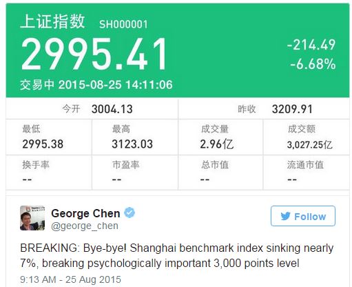 Το χρηματιστήριο της Σαγκάης, υποχωρεί κάτω από τα επίπεδα των 3.000 μονάδων για πρώτη φορά από το Δεκέμβριο του 2014 με πτώση σημαντική κοντά στο 6%-7%.