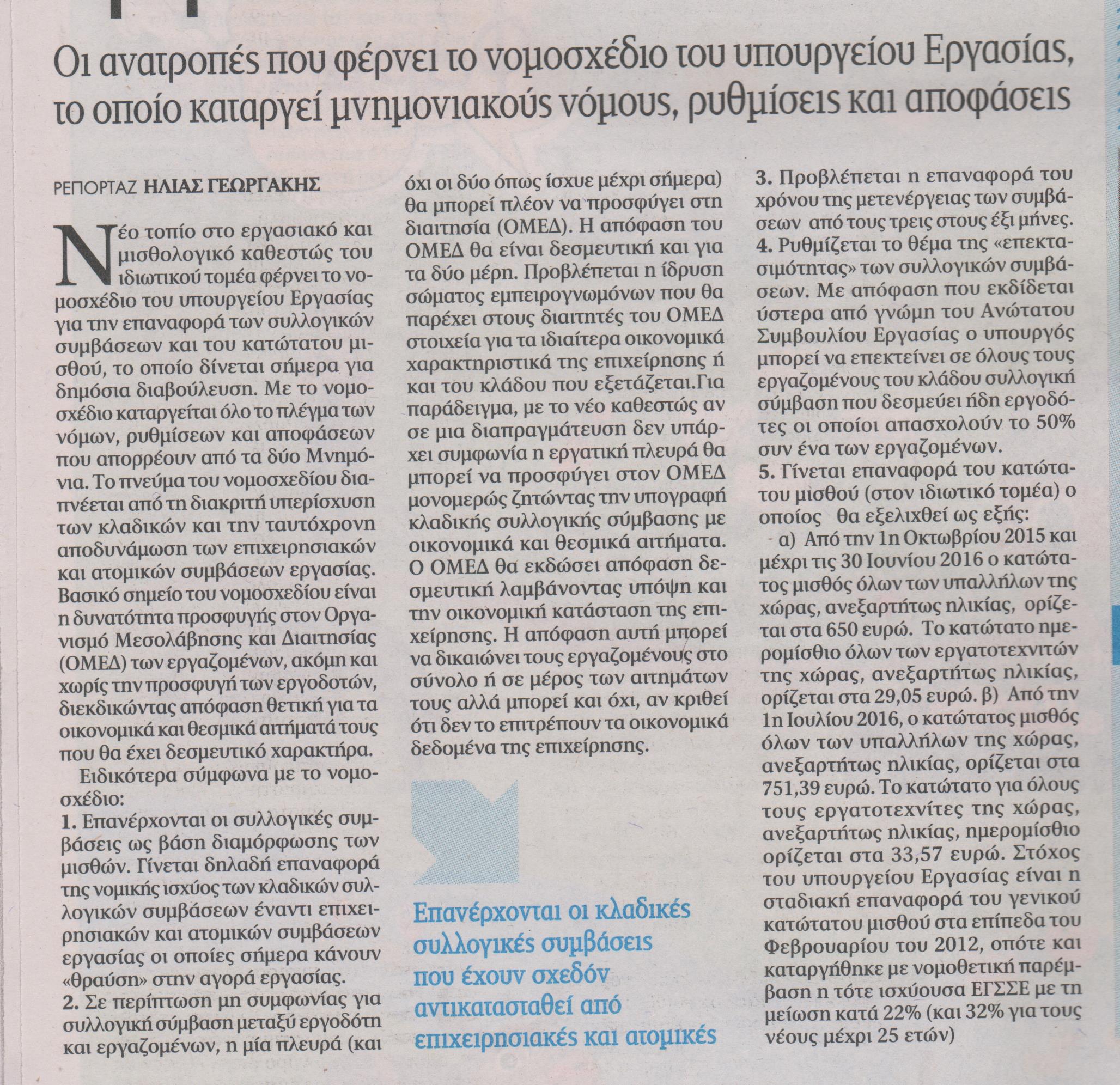 Με το νομοσχέδιο καταργείται όλο το πλέγμα των νόμων, ρυθμίσεων και αποφάσεων που απορρέουν από τα δύο Μνημόνια. Το πνεύμα του νομοσχεδίου διαπνέεται από τη διακριτή υπερίσχυση των κλαδικών και την ταυτόχρονη αποδυνάμωση των επιχειρησιακών και ατομικών συμβάσεων εργασίας.