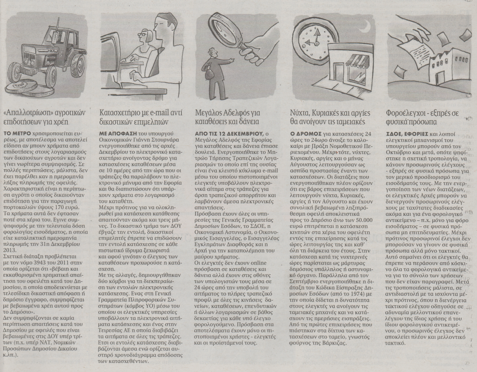 Τα κατασχετήρια από χάρτινα και με τον αραμπά έγιναν ηλεκτρονικά, οι ελεγκτές δεν χρειάζεται να περιμένουν έως και τέσσερις μήνες για να αποκτήσουν εικόνα των τραπεζικών λογαριασμών φορολογούμενων που ελέγχονται, βλέπουν καταθέσεις και δάνεια με ένα κλικ, οι κατασχέσεις -με εξαίρεση τα σπίτια- γίνονται χωρίς προειδοποίηση και όσοι περιμένουν, για παράδειγμα, πληρωμή επιδότησης διαπιστώνουν ότι πριν από αυτούς πληρώθηκε η εφορία, ακόμα κι αν δεν έχει λήξει η δόση.