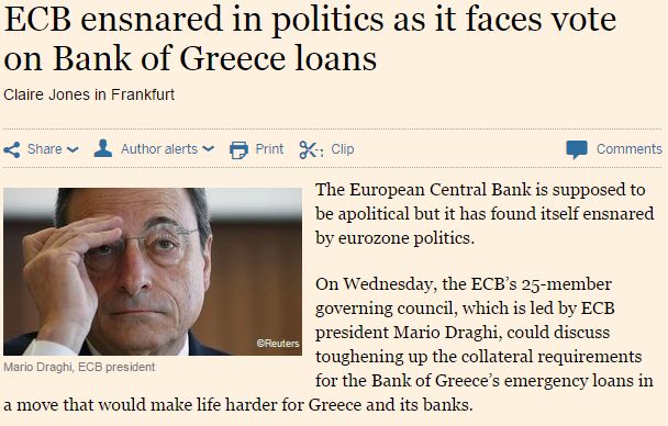 Η εφημερίδα Financial Times σημειώνουν πως στην ΕΚΤ τα «γεράκια», οι σκληροί, κυρίως από τη Γερμανία πιέζουν για αυστηρή στάση προς την Ελλάδα, με τίτλο: «Η ΕΚΤ παγιδευμένη στην πολιτική, αντιμέτωπη με μια ψηφοφορία για τα δάνεια της Τράπεζας της Ελλάδας».