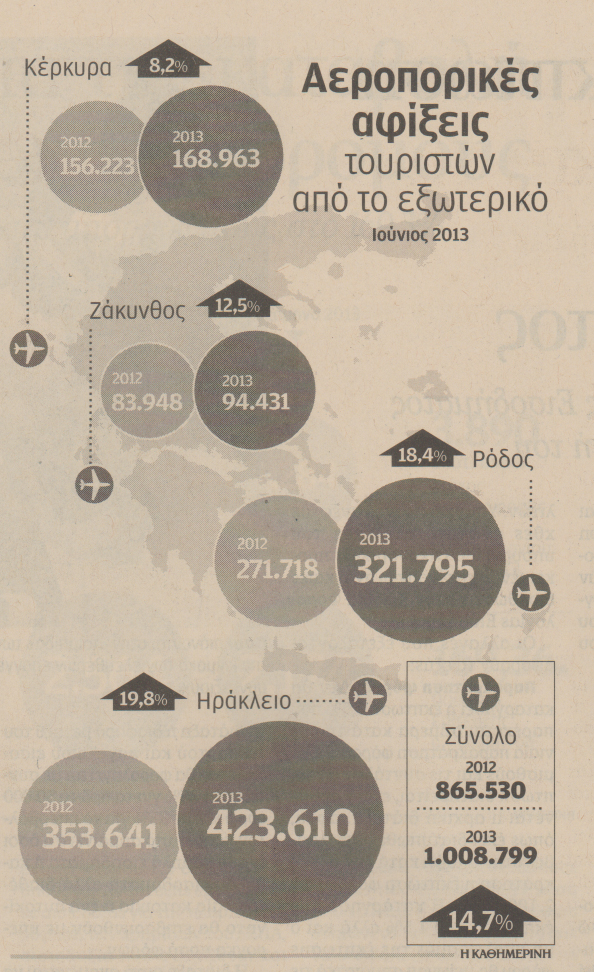 Σύμφωνα με τα πρώτα διαθέσιμα στοιχεία σε 4 αεροδρόμια της χώρας, στο Ηράκλειο, στη Ρόδο, στη Ζάκυνθο και στην Κέρκυρα, οι συνολικές αφίξεις από το εξωτερικό για τον Ιούνιο ξεπέρασαν το 1εκατ. παρουσιάζοντας αύξηση κατά 14,7% σε σχέση με τον ίδιο μήνα πέρσι.