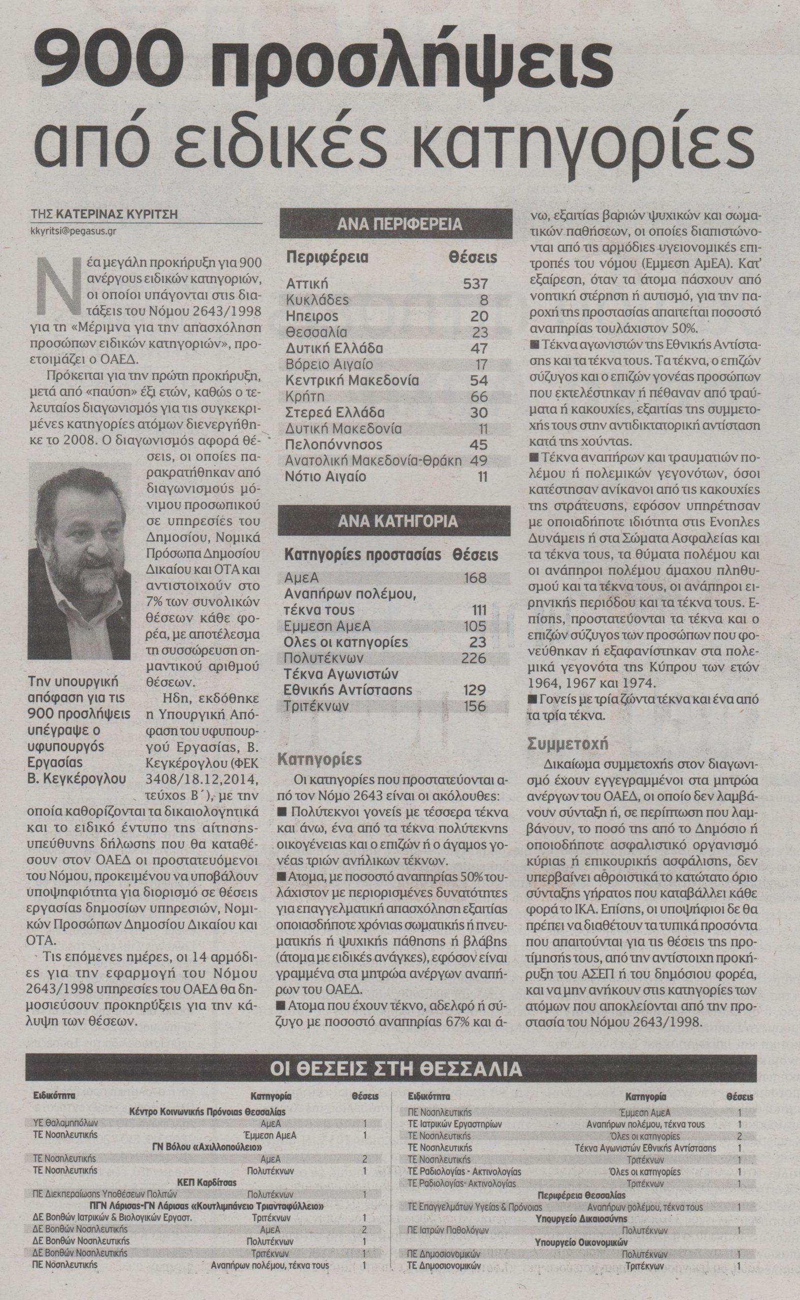 Ζήτημα ημερών είναι η προκήρυξη από τον ΟΑΕΔ 900 μόνιμων θέσεων στο Δημόσιο για ΑΜΕΑ, τρίτεκνους, πολύτεκνους και άλλες ειδικές κατηγορίες του Νόμου 2643