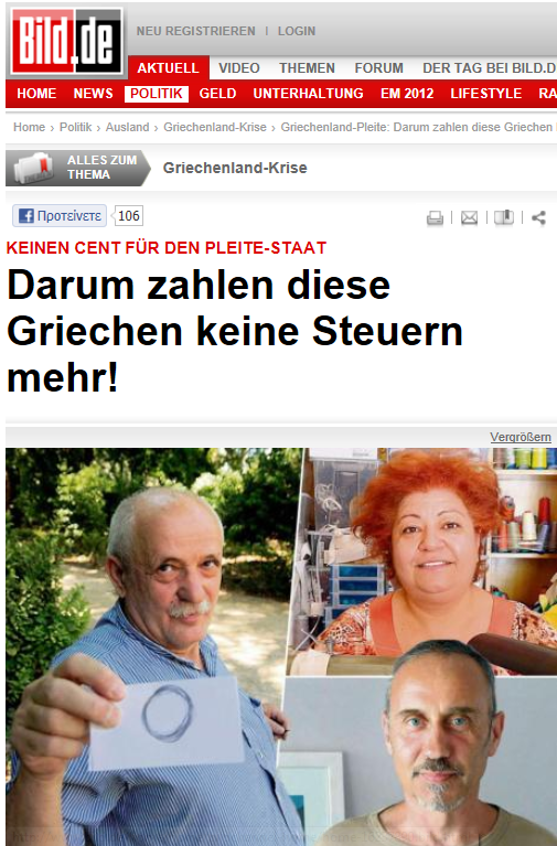 «Για αυτό οι Έλληνες δεν πληρώνουν φόρους» είναι ο τίτλος δημοσιεύματος της Bild, στο οποίο η γερμανική εφημερίδα εξηγεί ότι «το γεγονός ότι η Ελλάδα δεν μπορεί θέσει το χρέος και το δημοσιονομικό της έλλειμμα υπό έλεγχο, οφείλεται στο ότι οι ίδιοι οι Έλληνες πολίτες δεν πληρώνουν τους φόρους τους».
