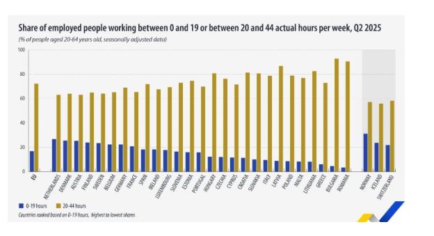 Λίγοι είναι οι Έλληνες σε σχέση με τις άλλες χώρες της ΕΕ που εργάζονται με καθεστώς μερικής απασχόλησης. Συγκεκριμένα το 6,1% των Ελλήνων δούλεψε έως 19 ώρες την εβδομάδα κατά το β’ τρίμηνο του 2025 από 16,9% που ήταν κατά μέσο όρο στην ΕΕ.