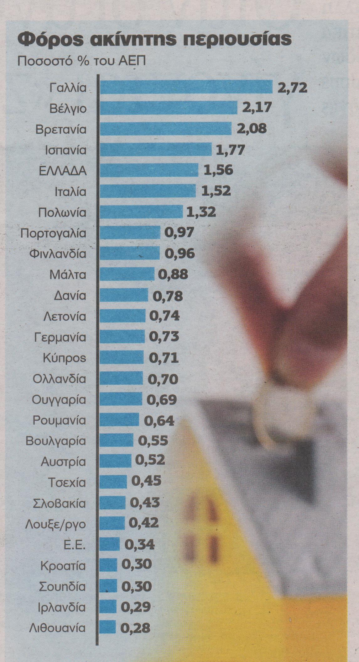Ο Φόρος Ακίνητης Περιουσίας που καταβάλλουν οι έλληνες ως φυσικά πρόσωπα αντιστοιχεί στο 1,56% του ΑΕΠ την ώρα που ο μέσος ευρωπαϊκός όρος βρίσκεται μόλις στο 0,89% του ΑΕΠ.