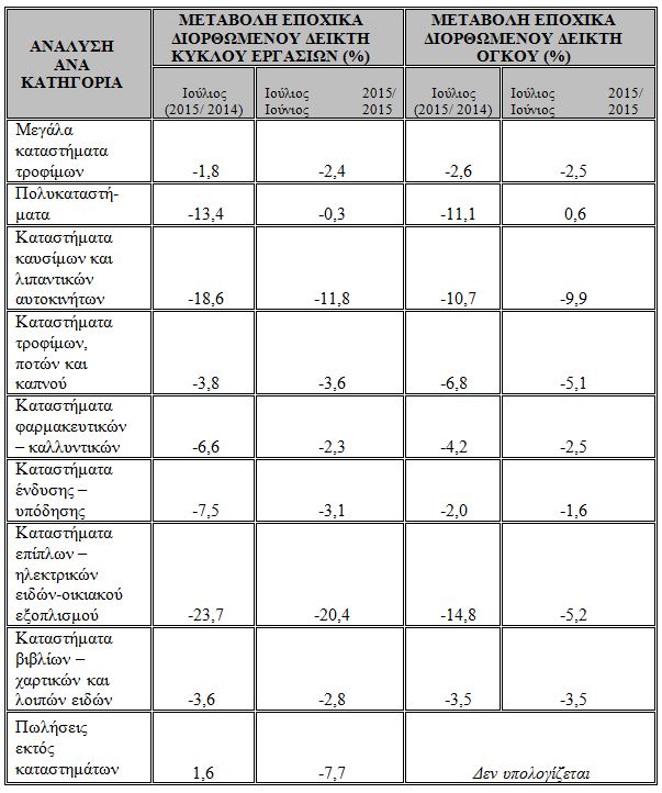 • Ο εποχικά διορθωμένος Δείκτης Όγκου στο Λιανικό Εμπόριο για το μήνα Ιούλιο 2015 (χωρίς τα καύσιμα), σε σύγκριση με τον αντίστοιχο Δείκτη του Ιουλίου 2014, παρουσίασε μείωση κατά 4,7%, έναντι αύξησης 2,6% που σημειώθηκε κατά την αντίστοιχη σύγκριση του έτους 2014 προς το 2013.