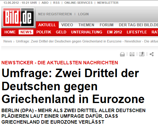 Νέα δημοσκόπηση δημοσιεύει σήμερα η γερμανική εφημερίδα Bild σύμφωνα με την οποία το 69% των Γερμανών πολιτών τάσσεται υπέρ της εξόδου της Ελλάδας από την Ευρωζώνη, ενώ μόνο το 17% των ερωτηθέντων υποστηρίζει την παραπμονή της χώρας μας στο ενιαίο νόμισμα. “Βέβαια, η τελική απόφαση θα ληφθεί από τους Έλληνες” σχολιάζει η γερμανική εφημερίδα αναφερόμενη στις επικείμενες εκλογές και συμπληρώνει:”Στις 17 Ιουνίου οι Έλληνες θα αποφασίσουν εάν θα τηρήσουν τις δεσμεύσεις και θα εφαρμόσουν το πρόγραμμα λιτότητας ή αν θα εγκαταλείψουν την Ευρωζώνη.”