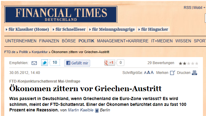 “Οι Γερμανοί οικονομολόγοι τρέμουν την έξοδο της Ελλάδας” είναι ο τίτλος δημοσιεύματος της γερμανικής έκδοσης της Financial Times, στο οποίο αναλύονται οι συνέπειες που θα είχε η Γερμανία και η οικονομία της στην περίπτωση που η Ελλάδα αποχωρήσει τελικά από την Ευρωζώνη.