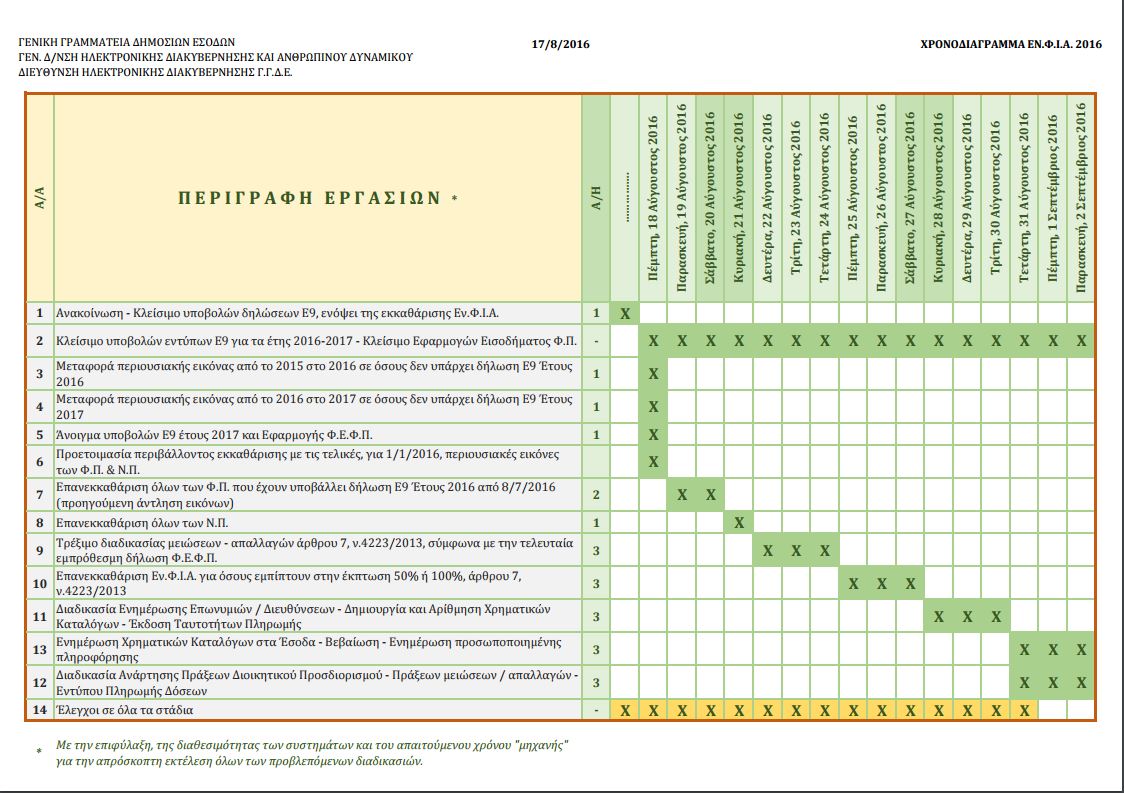Όπως προκύπτει από τον πίνακα, από τις 18 Αυγούστου έχει ολοκληρωθεί η εκκαθάριση του φόρου ενώ από την προσεχή Δευτέρα 29 Αυγούστου, ξεκινά η έκδοση ταυτοτήτων πληρωμής για τον ΕΝΦΙΑ.