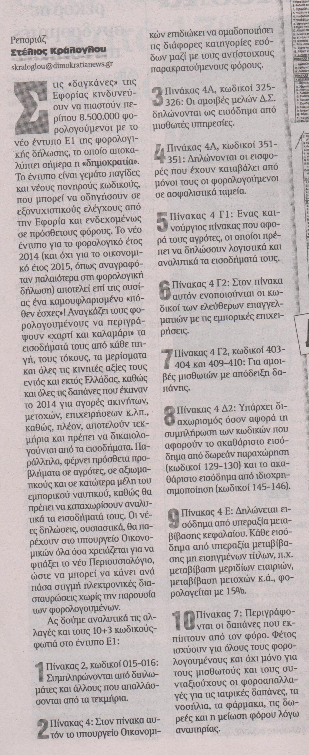 Στις «δαγκάνες» της Εφορίας κινδυνεύουν να πιαστούν περίπου 8.500.000 φορολογούμενοι με το νέο έντυπο Ε1 της φορολογικής δήλωσης , το οποίο αποκαλύπτει σήμερα η «δημοκρατία». Το έντυπο είναι γεμάτο παγίδες και νέους πονηρούς κωδικούς που μπορεί να οδηγήσουν σε εξονυχιστικούς ελέγχους από την Εφορία και ενδεχομένως σε πρόσθετους φόρους.