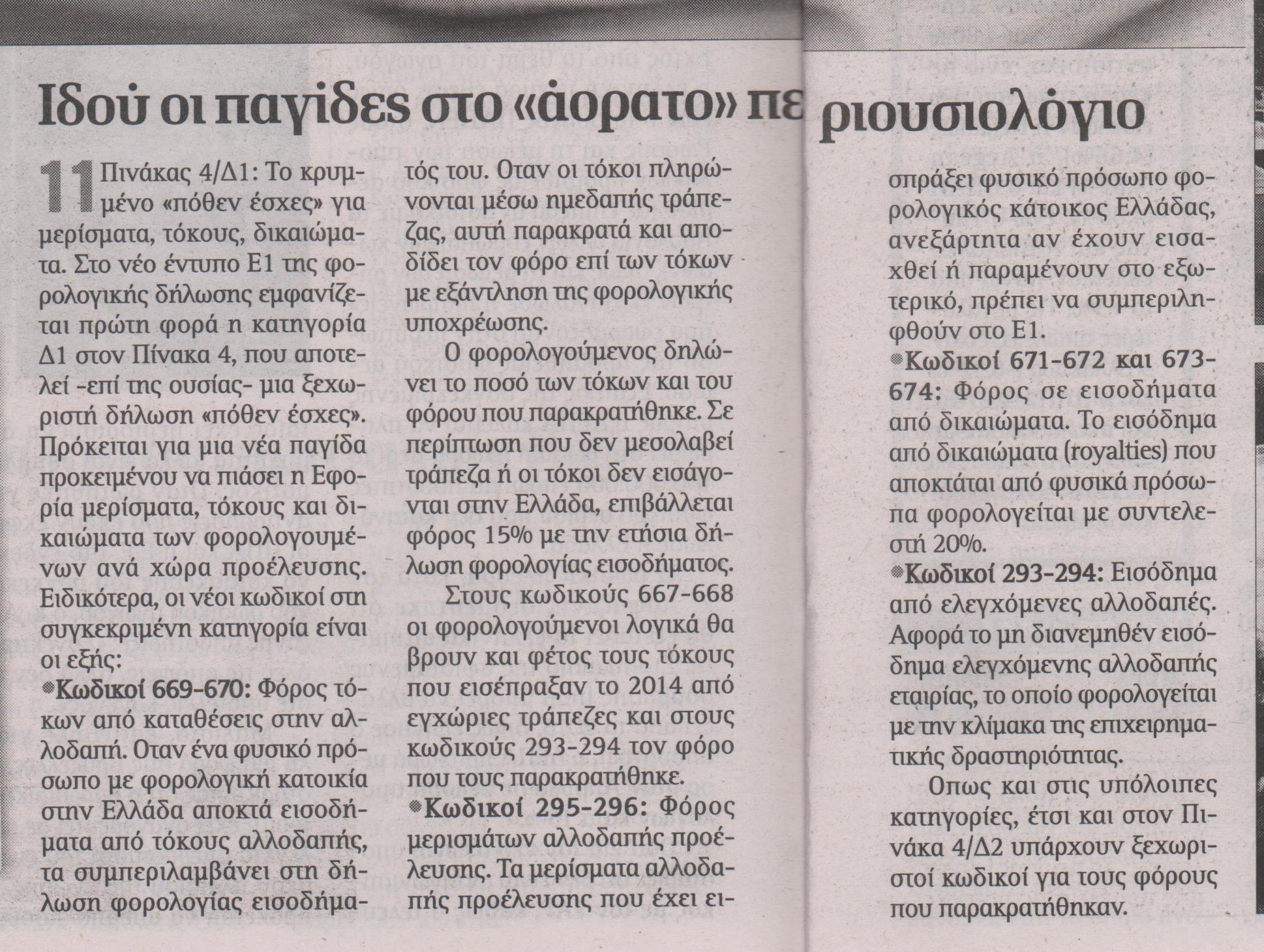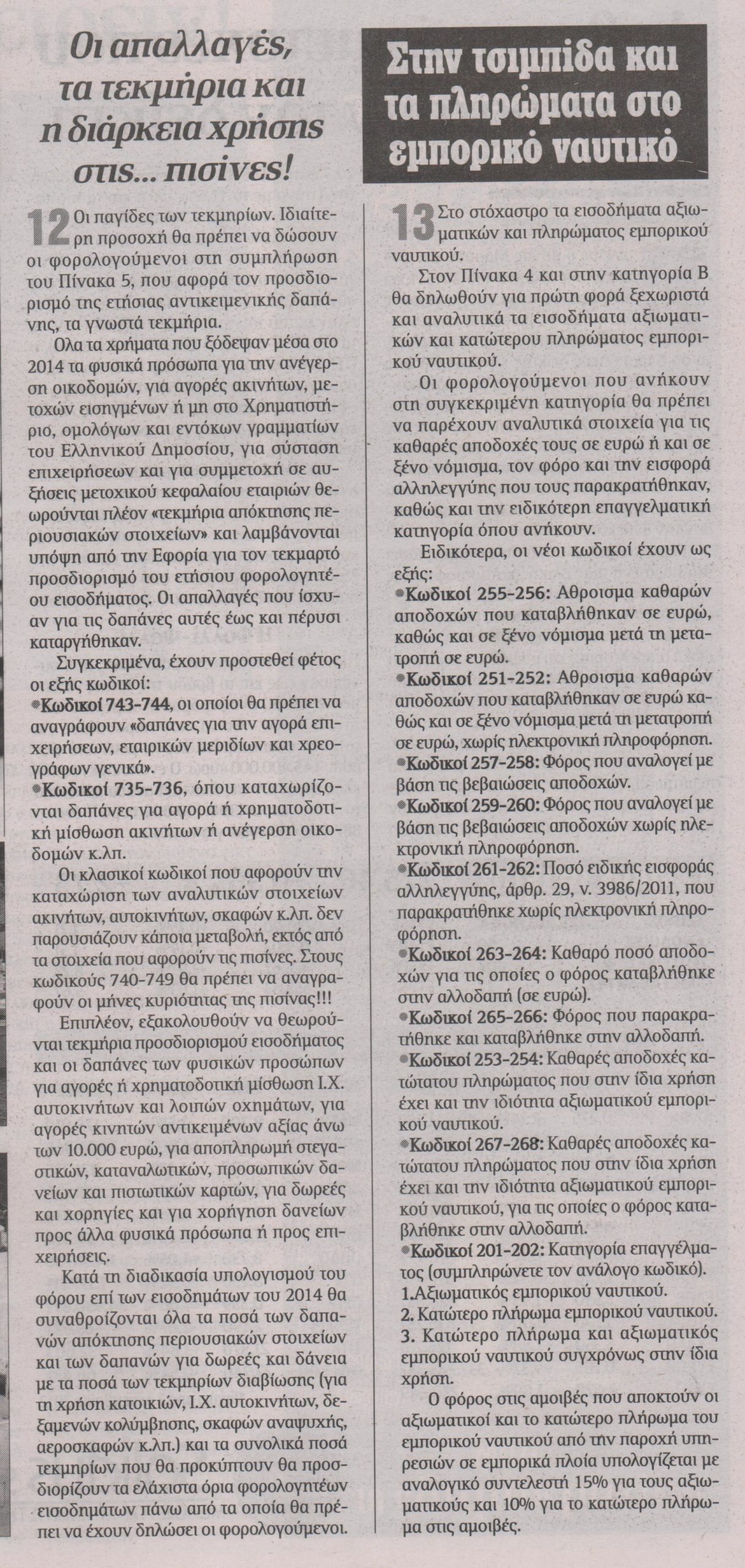 Το νέο έντυπο για το φορολογικό έτος 2014( και όχι για το οικονομικό έτος 2015, όπως αναγραφόταν παλαιότερα στη φορολογική δήλωση) αποτελεί επί της ουσίας ένα καμουφλαρισμένο «πόθεν έσχες»! Αναγκάζει τους φορολογουμένους να περιγράψουν «χαρτί και καλαμάρι» τα εισοδήματα τους από κάθε πηγή, τους τόκους, τα μερίσματα και όλες τις κινητές αξίες τους εντός και εκτός Ελλάδας, καθώς και όλες τις δαπάνες που έκαναν το 2014 για αγορές ακινήτων, μετοχών, επιχειρήσεων κλπ, καθώς, πλέον, αποτελούν τεκμήρια και πρέπει να δικαιολογούνται από τα εισοδήματα.