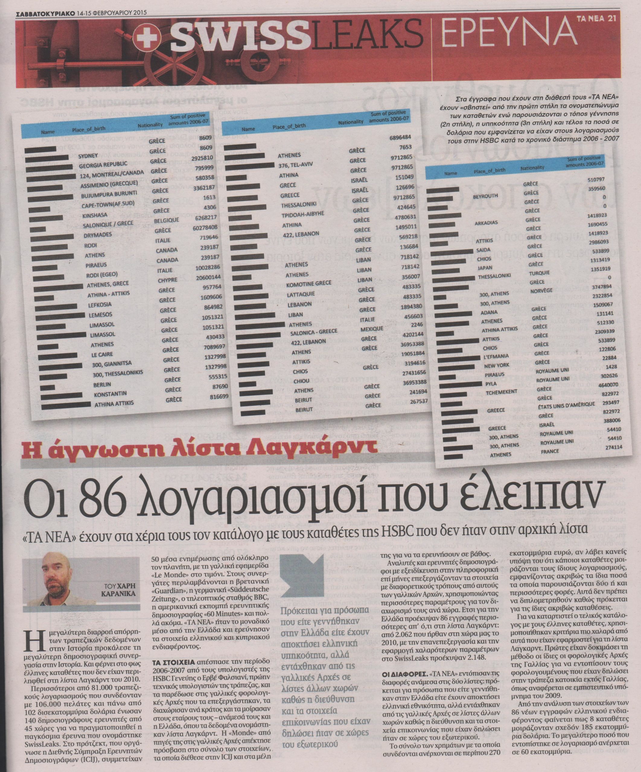 Η μεγαλύτερη διαρροή απόρρητων τραπεζικών δεδομένων στην ιστορία προκάλεσε τη μεγαλύτερη δημοσιογραφική συνεργασία στην ιστορία. Και φέρνει στο φως Έλληνες καταθέτες που δεν είχαν περιληφθεί στη λίστα Λαγκάρντ του 2010.