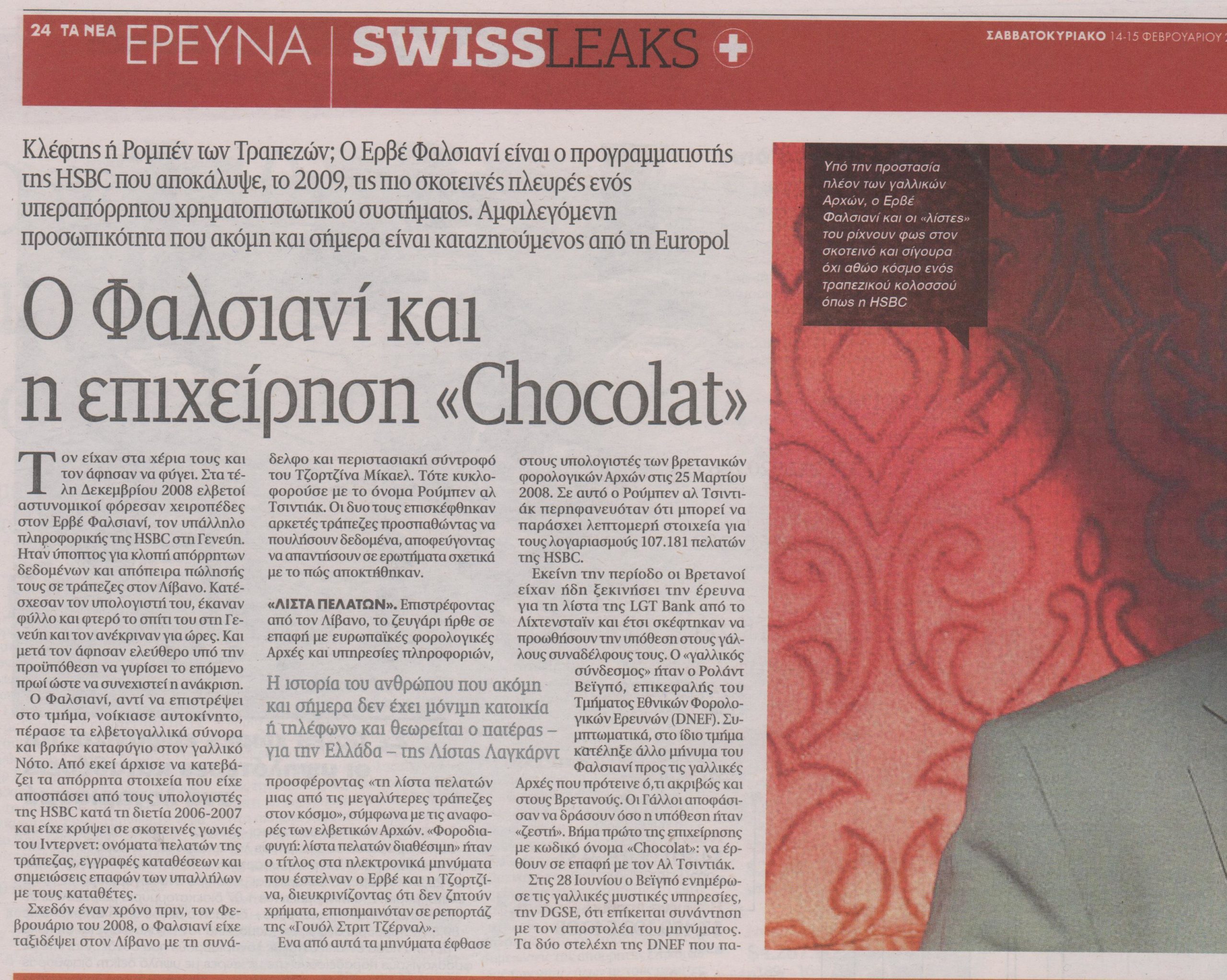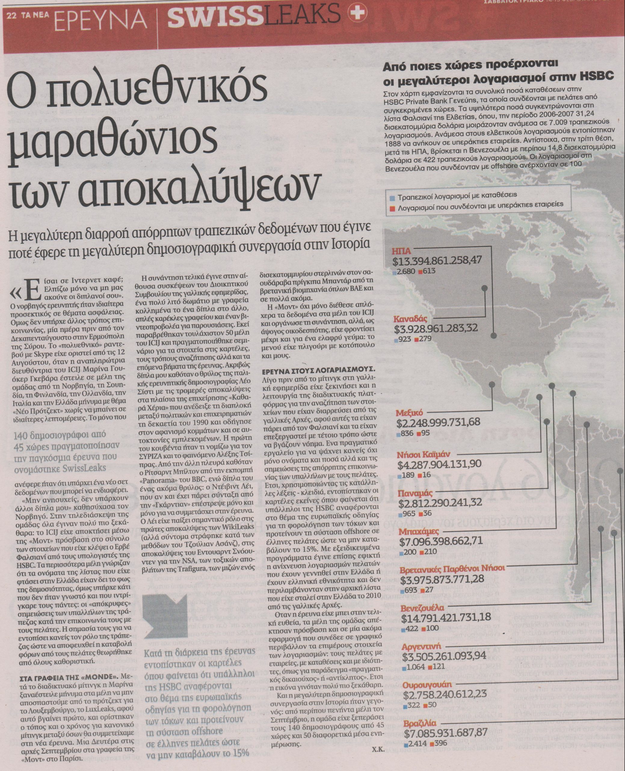 Περισσότεροι από 81.000 τραπεζικούς λογαριασμούς που συνδέονταν με 106.000 πελάτες και πάνω από 102 δισεκατομμύρια δολάρια ένωσαν 140 δημοσιογράφους ερευνητές από 45 χώρες για να πραγματοποιηθεί η παγκόσμια έρευνα που ονομάστηκε SwissLeaks. Στο πρότζεκτ που οργάνωσε η Διεθνής Σύμπραξη Ερευνητών Δημοσιογράφων (ICIJ), συμμετείχαν 50 μέσα ενημέρωσης από ολόκληρο τον πλανήτη, με τη γαλλική εφημερίδα “Le Monde” στο τιμόνι. Στους συνεργάτες περιλαμβάνονται η βρετανική “Guardian”, η γερμανική “Süddeutsche Zeitung”, ο τηλεοπτικός σταθμός BBC, η αμερικανική εκπομπή ερευνητικής δημοσιογραφίας “60 Minutes” και πολλά ακόμα.