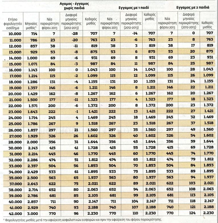«Χαμένοι» σε όλα τα φορολογικά κλιμάκια θα είναι από το νέο έτος οι μισθοί των έγγαμων με δύο παιδιά λόγω της αυξημένης παρακράτησης φόρου, η οποία και θα οδηγήσει σε αντίστοιχη μείωση του μισθού. Για παράδειγμα, έγγαμος με δύο παιδιά θα δηλώνει ετήσιο εισόδημα 16.000 ευρώ (μηνιαίος φορολογητέος μισθός 1.143 ευρώ) θα δει από τον πρώτο μήνα του 2013 να μειώνεται ο μισθός του κατά 28 ευρώ.