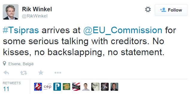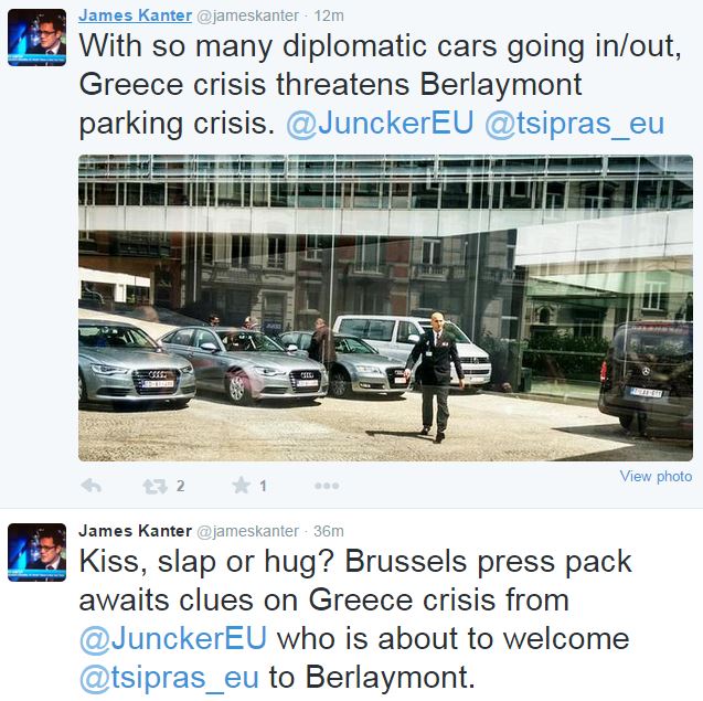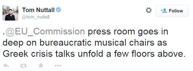 «Η αίθουσα Τύπου της Κομισιόν φαίνεται να είναι χωμένη βαθειά στο παιχνίδι της γραφειοκρατία με τις μουσικές καρέκλες (όπως και οι θεσμοί) στις συνομιλίες με την Ελλάδας μερικά πατώματα πιο ψηλά στο ίδιο κτήριο», σχολιάζει με ένα tweet o Τομ Νούταλ από το Economist.