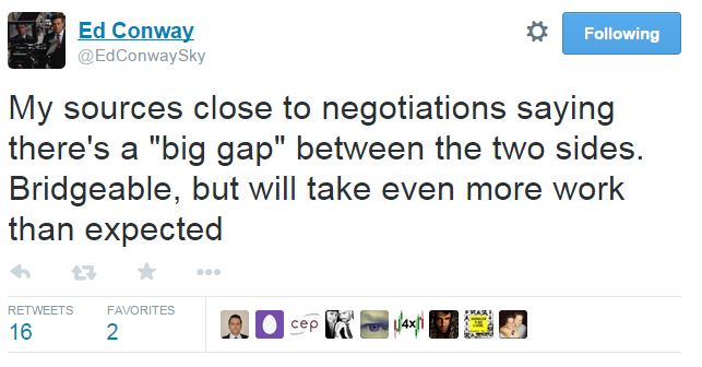 «Οι πηγές μου κοντά στις διαπραγματεύσεις λένε ότι υπάρχει “μεγάλο χάσμα” μεταξύ των δύο πλευρών, το οποίο μπορεί να γεφυρωθεί αλλά θα χρειαστεί περισσότερη δουλειά από ό, τι αναμενόταν», γράφει στο twitter o Εντ Κόνγουεϊ από το Sky News.