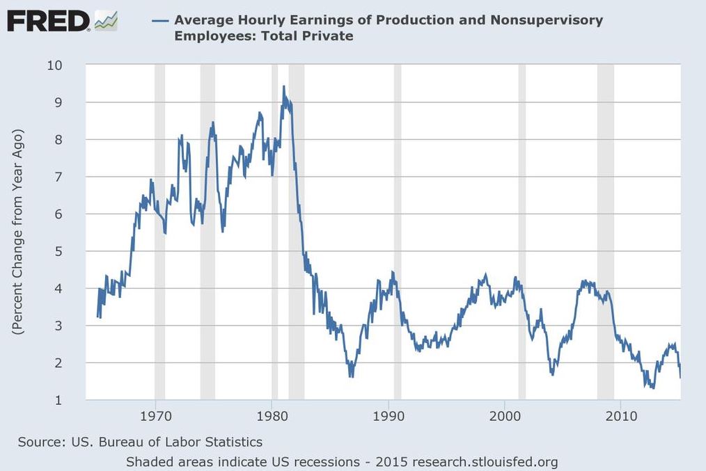 Ιδιαίτερα τα τελευταία χρόνια της μεγάλης ύφεσης και της ανάκαμψης -δια χειρός Fed- η πορεία των μισθών (μέσες ωριαίες απολαβές) αδυνατεί να σηκωθεί, όπως φαίνεται στο διάγραμμα…