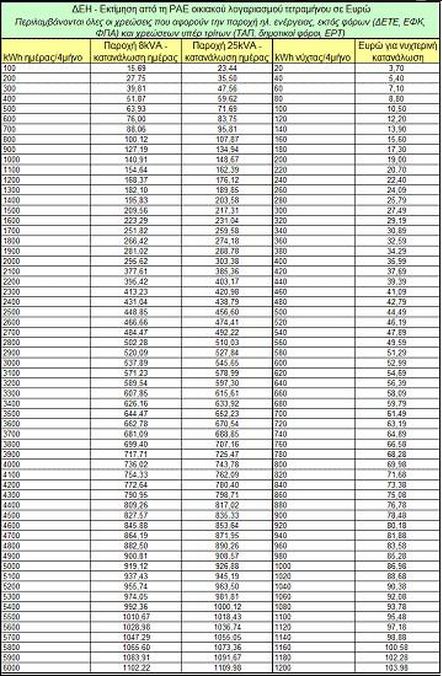 Οι καταναλωτές της χαμηλής τάσης θα μπορούν έτσι να έχουν μία εικόνα για τις δαπάνες που χρειάζονται. Ωστόσο, πρέπει να σημειωθεί ότι στον πίνακα που εξέδωσε η ΡΑΕ δεν περιλαμβάνονται οι χρεώσεις (ΕΦΚ, ΔΕΤΕ, ΦΠΑ, ΤΑΠ, δημοτικά τέλη και ΕΡΤ). Πρόκειται ουσιαστικά για τα καθαρά ποσά ηλεκτρικής ενέργειας.