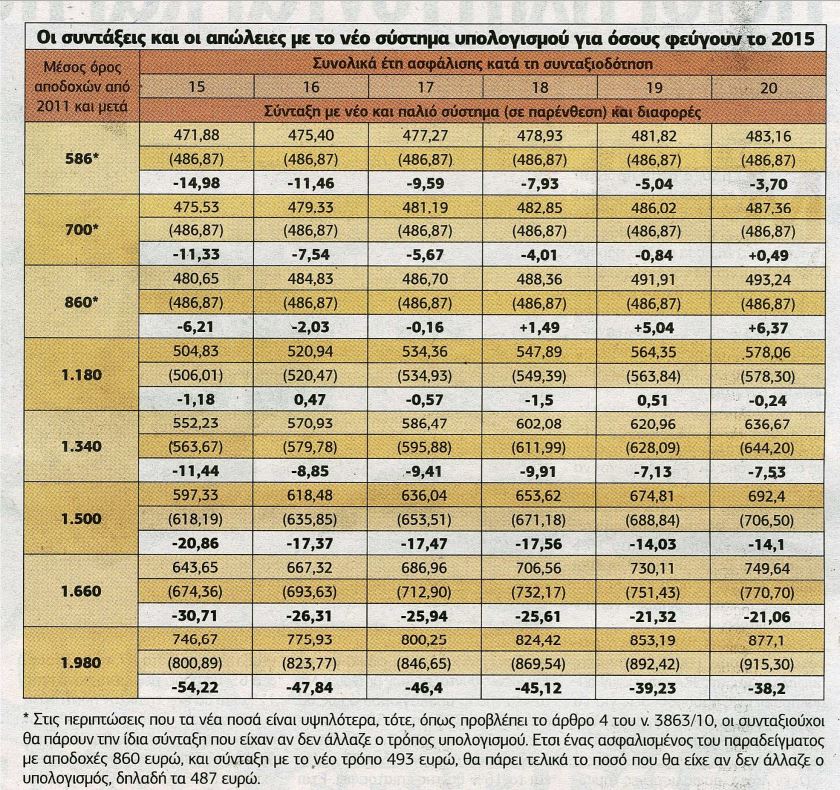Διαβάστε στον πίνακα, που δημοσιεύει η εφημερίδα, παραδείγματα με ποσά συντάξεων και τις απώλειες που θα επέλθουν με το νέο σύστημα υπολογισμού για όσους «φεύγουν» το 2015.