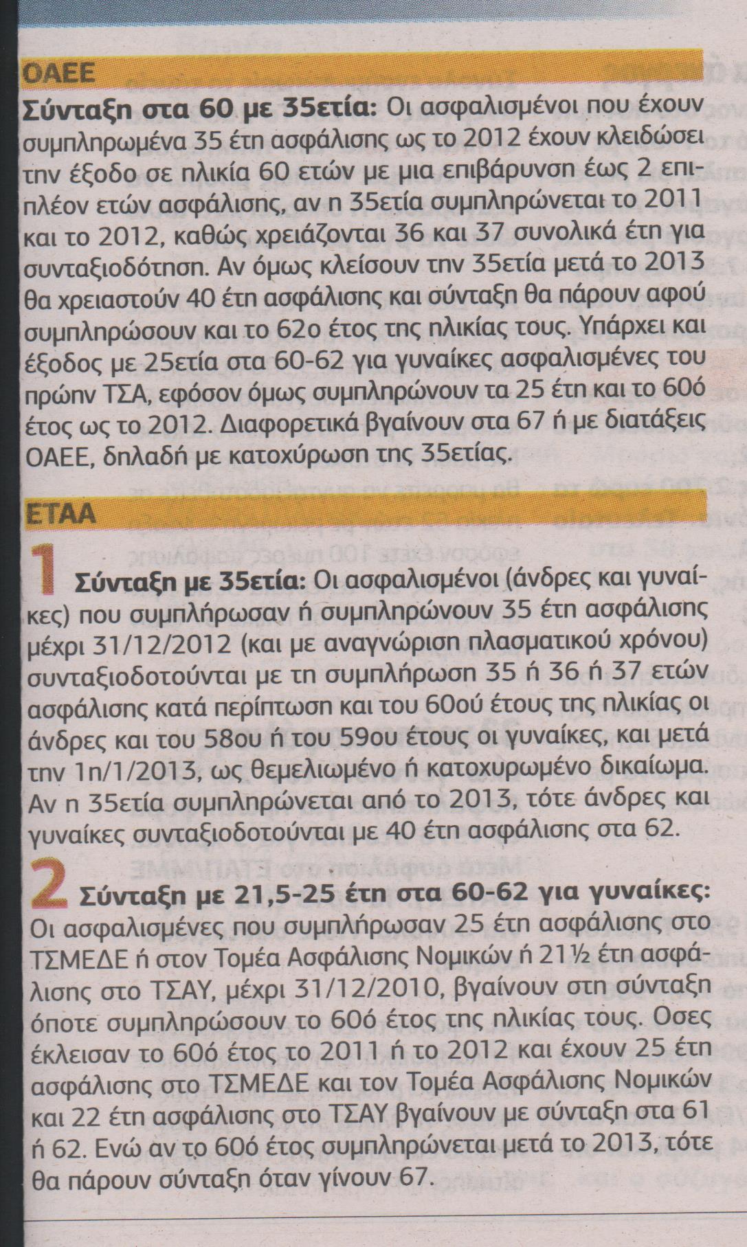 Σύνταξη πριν από τα 67 παίρνουν οι ασφαλισμένοι που συμπληρώνουν 25 έτη ασφάλισης ως το 2012, κατοχυρώνοντας έτσι την ηλικία εξόδου που ισχύει κατά το έτος που συμπληρώνουν τον απαιτούμενο χρόνο ασφάλισης.