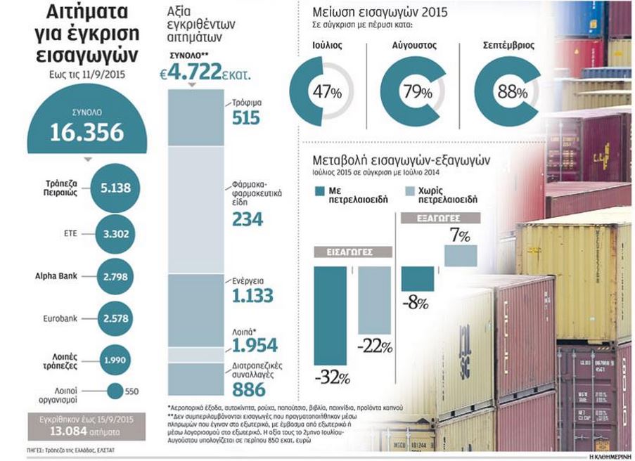 Λιγότερες από τις μισές σε σχέση με τον περσινό Ιούλιο ήταν οι εισαγωγές που πραγματοποιήθηκαν τον φετινό Ιούλιο, τον μήνα που σημαδεύτηκε από την τραπεζική αργία, τους κεφαλαιακούς ελέγχους, το δημοψήφισμα, αλλά και τη συμφωνία με τους δανειστές. Βάσει των επίσημων στοιχείων της Τράπεζας της Ελλάδος, η αξία των εισαγωγών που πραγματοποιήθηκε τον φετινό Ιούλιο διαμορφώθηκε στο 47% της αξίας των εισαγωγών του Ιουλίου του 2014. Τον Αύγουστο το ποσοστό αυξήθηκε στο 79%, ενώ, σύμφωνα με τις εκτιμήσεις που υπάρχουν για τον Σεπτέμβριο, προβλέπεται ότι ο μήνας θα κλείσει με την αξία των εισαγωγών να ανέρχεται περίπου στο 88% της αξίας των εισαγωγών του περσινού Σεπτεμβρίου.