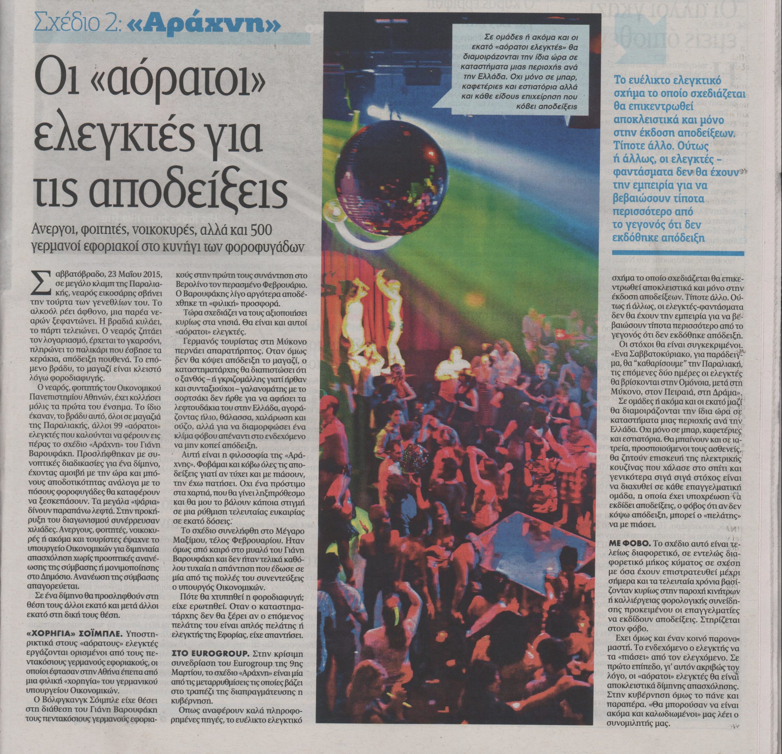 Μετά τις κινήσεις εξπρές, έρχονται τα μέτρα, με τα οποία φιλοδοξεί να βάλει φρένο στο σπορ της φοροδιαφυγής. Σχέδιο Αράχνη για τις αποδείξεις, με «αόρατους» ελεγκτές, άνεργους και φοιτητές, δίμηνης απασχόλησης οι οποίοι θα το παίζουν πελάτες.