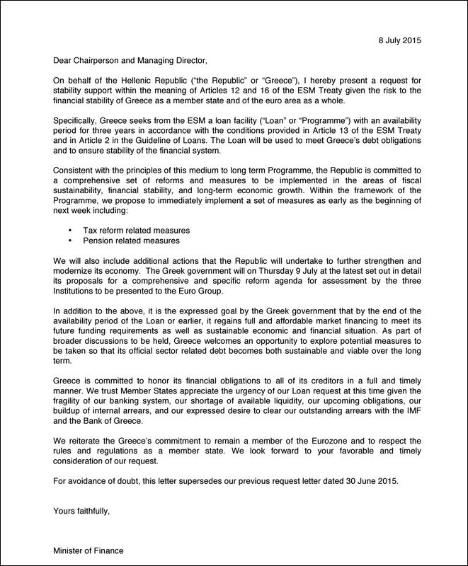 Αίτημα για χρηματοδότηση προς στον Πρόεδρο και Διευθύνοντα Σύμβουλο του Ευρωπαϊκού Μηχανισμού Σταθερότητας (ESM) απέστειλε εκ μέρους της ελληνικής κυβέρνησης ο υπουργός Οικονομικών, Ευκλείδης Τσακαλώτος.