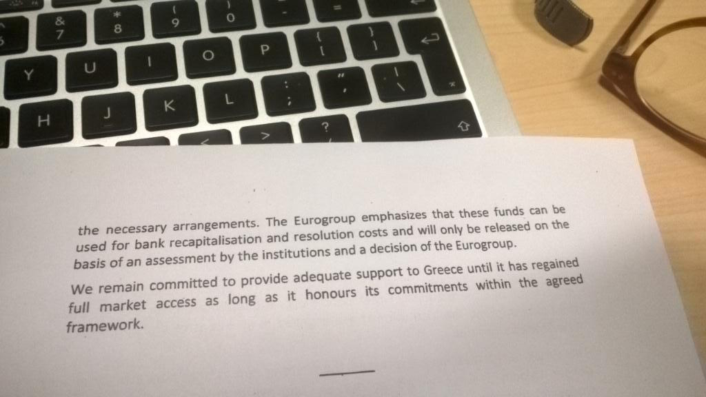 Επιπλέον, ενημερωθήκαμε από το Ευρωπαϊκό Συμβούλιο, την Ευρωπαϊκή Κεντρική Τράπεζα και το Διεθνές Νομισματικό Ταμείο ότι θα ήταν φρόνιμο να παραταθεί η περίοδος διαθεσιμότητας των ομολόγων του EFSF στο Ελληνικό Ταμείο Χρηματοπιστωτικής Σταθερότητας για έξι μήνες, παράλληλα με την παράταση του προγράμματος του Ευρωπαϊκού Ταμείου Χρηματοπιστωτικής Σταθερότητας. Το Eurogroup θα επιθυμούσε μια τέτοια παράταση. Ακολουθώντας ένας ελληνικό αίτημα, το Ευρωπαϊκό Ταμείο Χρηματοπιστωτικής Σταθερότητας θα μπορούσε να προβεί στους απαραίτητους διακανονισμούς. Το Eurogroup υπογραμμίζει με έμφαση ότι τα κεφάλαια αυτά θα μπορούσαν να χρησιμοποιηθούν για την ανακεφαλαιοποίηση των τραπεζών και προϋπολογισμένα κόστη, και θα απελευθερώνονται μόνο κατόπιν αξιολόγησης από τους θεσμικούς και τη θετική γνωμοδότηση του Eurogroup.