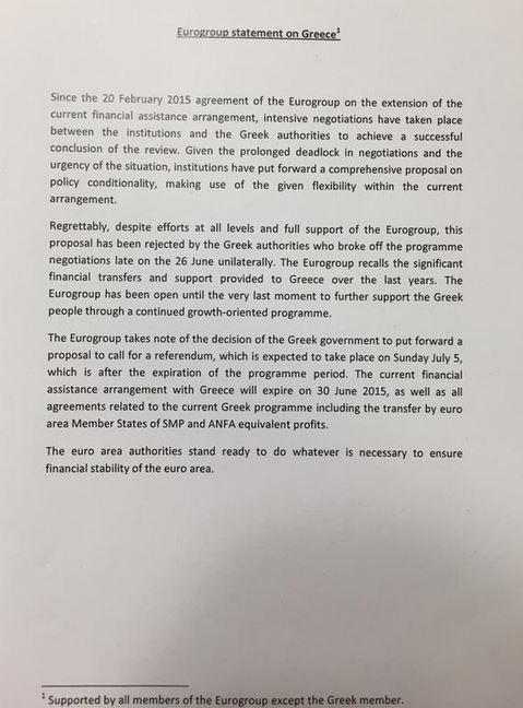 Δείτε το έγγραφο της δήλωσης του Eurogroup για την απόφαση της ελληνικής κυβέρνησης να πάει σε δημοψήφισμα.