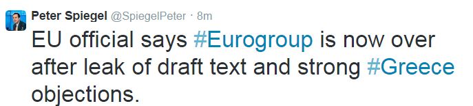 «Αξιωματούχοι της ΕΕ λένε ότι το Eurogroup ολοκληρώθηκε έπειτα από τη διαρροή του κειμένου και τις έντονες αντιρρήσεις της Ελλάδας», έγραψε ο δημοσιογράφος στο Twitter.