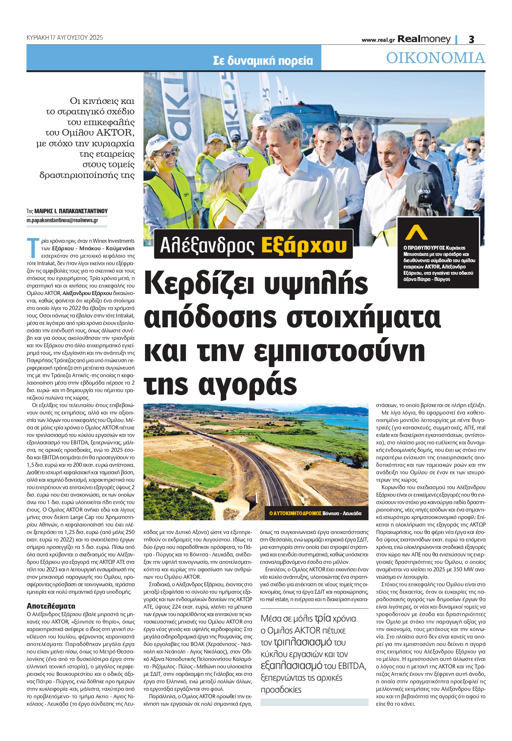 Κορωνίδα του σχεδιασμού του Αλέξανδρου Εξάρχου είναι οι επικείμενες εξαγορές που θα ενισχύσουν τον στόχο για καινούργια πεδία δραστηριοποίησης, νέες πηγές εσόδων και ένα σημαντικά ισχυρότερο χρηματοοικονομικό προφίλ: Επίκειται η ολοκλήρωση της εξαγοράς της ΑΚΤΩΡ Παραχωρήσεις, που θα φέρει νέα έργα και έσοδα ύψους εκατοντάδων εκατ. ευρώ τα επόμενα χρόνια, ενώ ολοκληρώνονται σταδιακά εξαγορές στον χώρο των ΑΠΕ που θα ενισχύσουν τις ενεργειακές δραστηριότητες του Ομίλου, ο οποίος αναμένεται να κλείσει το 2025 με 350 MW ανανεώσιμα εν λειτουργία. Στόχος του επικεφαλής του Ομίλου είναι στο τέλος της δεκαετίας, όταν οι ευκαιρίες της παραδοσιακής αγοράς των δημοσίων έργων θα είναι λιγότερες, οι νέοι και δυναμικοί τομείς να τροφοδοτούν με έσοδα και δραστηριότητες τον Όμιλο με στόχο την παραγωγή αξίας για την οικονομία, τους μετόχους και την κοινωνία. Στο πλαίσιο αυτό δεν είναι κανείς να απορεί για την εμπιστοσύνη που δείχνει η αγορά στις εκτιμήσεις του Αλέξανδρου Εξάρχου για το μέλλον. Η εμπιστοσύνη αυτή άλλωστε είναι ο λόγος που η μετοχή της AKTOR και της Τράπεζας Αττικής έχουν την ξέφρενη αυτή άνοδο, η οποία στην πραγματικότητα προεξοφλεί τις μελλοντικές εκτιμήσεις του Αλέξανδρου Εξάρχου και τη βεβαιότητα της αγοράς ότι αφού το είπε θα το κάνει.