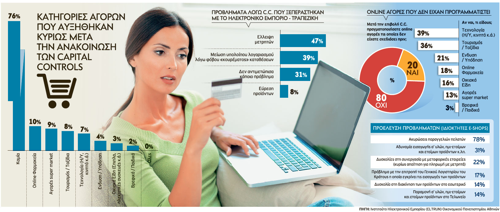 Την ίδια στιγμή, αν και μετά την ανακοίνωση των capital controls σε μεγάλο βαθμό οι αγορές περιορίστηκαν κυρίως σε είδη ένδυσης και υπόδησης, τα online φαρμακεία, οι αγορές σούπερ μάρκετ αλλά και τα τουριστικά προϊόντα αυξήθηκαν κατά 10%, 9% και 8% αντίστοιχα.