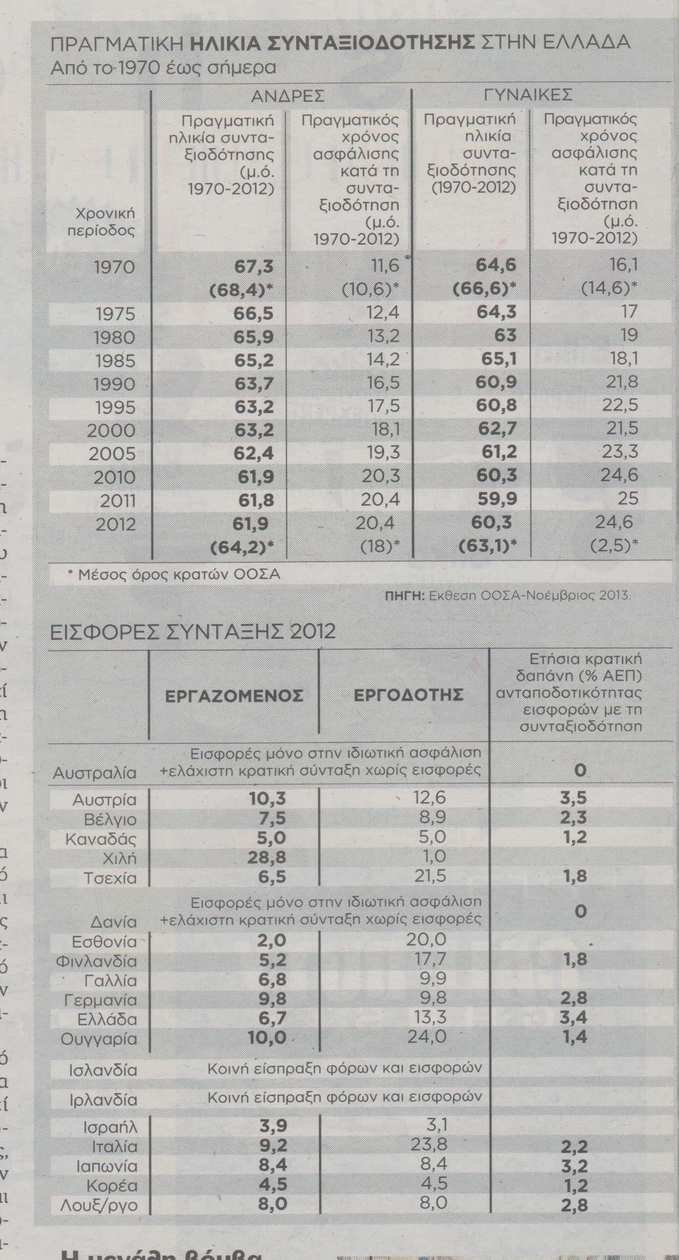 Την ίδια στιγμή παρά τις αλλαγές στο ασφαλιστικό, η μέση ηλικία αποχώρησης των ανδρών το 2012, είναι στα 61,9 έτη, ενώ οι γυναίκες συνταξιοδοτούνται στα 60,3 έτη. Η μέση ηλικίας συνταξιοδότησης των άλλων χωρών του ΟΟΣΑ, είναι 64,2 έτη και 63, 1 έτη, αντίστοιχα. Στην ουσία ο οργανισμός δείχνει ξεκάθαρα πως έρχεται και άλλη αύξηση όρια ηλικίας της συνταξιοδότησης, που πρόκειται να συζητηθούν μέσα στο 2014.