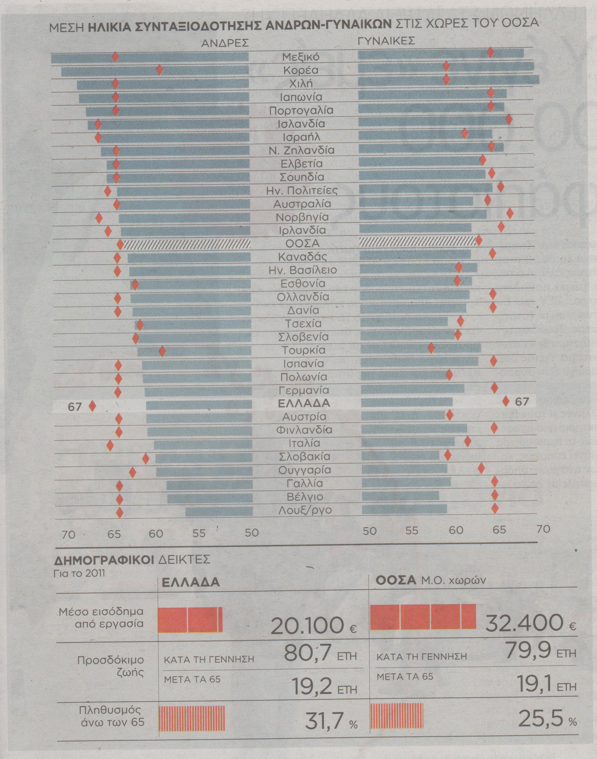 Τέλος ο ΟΟΣΑ, προβλέπει ότι ουδείς θα συνταξιοδοτείται πριν απο τα 67 έτη, μέχρι το 2020 και προσθέτει πως όσοι εισήλθαν στην ασφάλιση τα τελευταία χρόνια θα πάρουν σημαντικά μειωμένες συντάξεις σε σχέση με τις προηγούμενες γενιές.